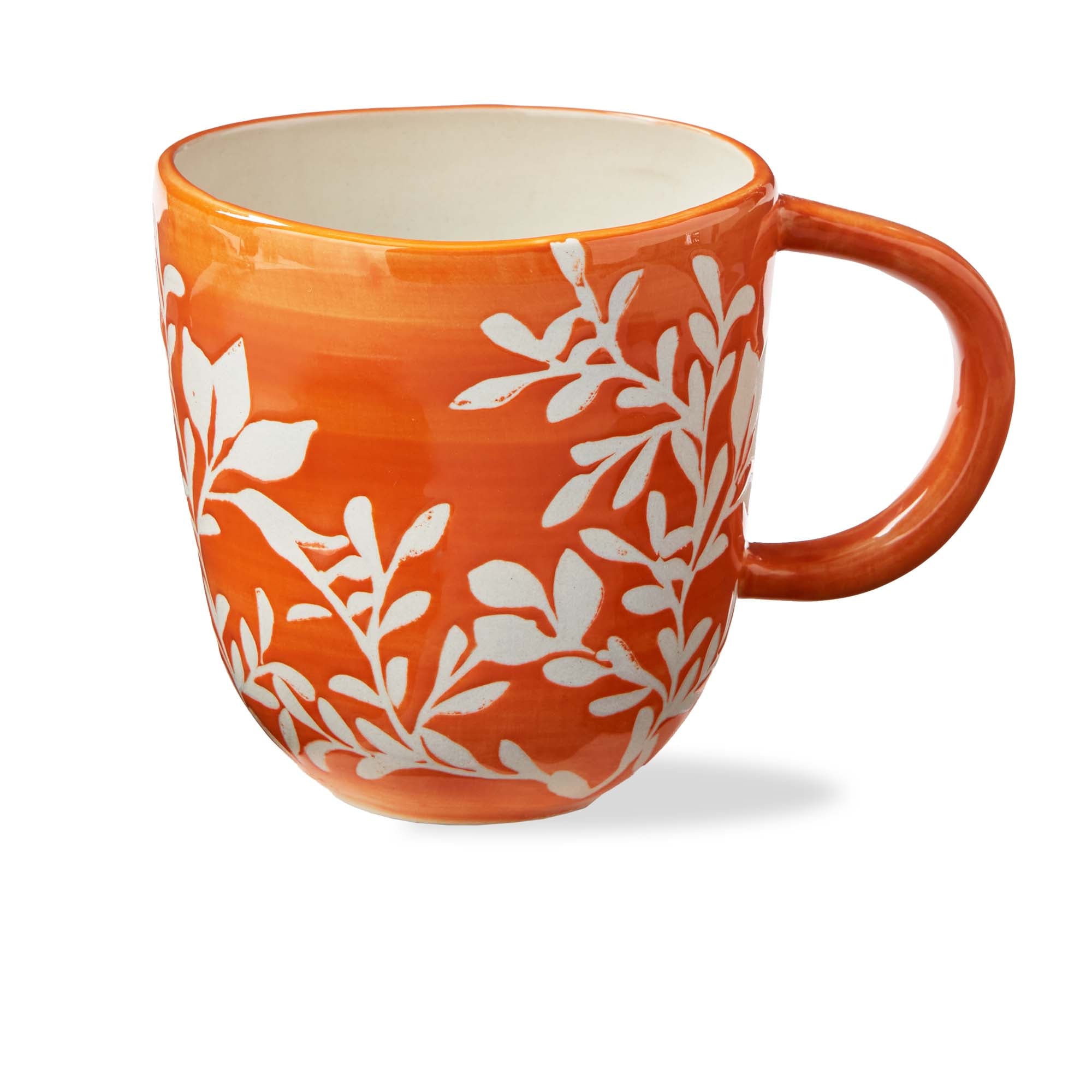 Embrace the beauty of autumn with this organic-shaped mug featuring white harvest leaves. Made from durable stoneware in a vibrant orange color, it's perfect for sipping hot beverages or using as a decorative piece.