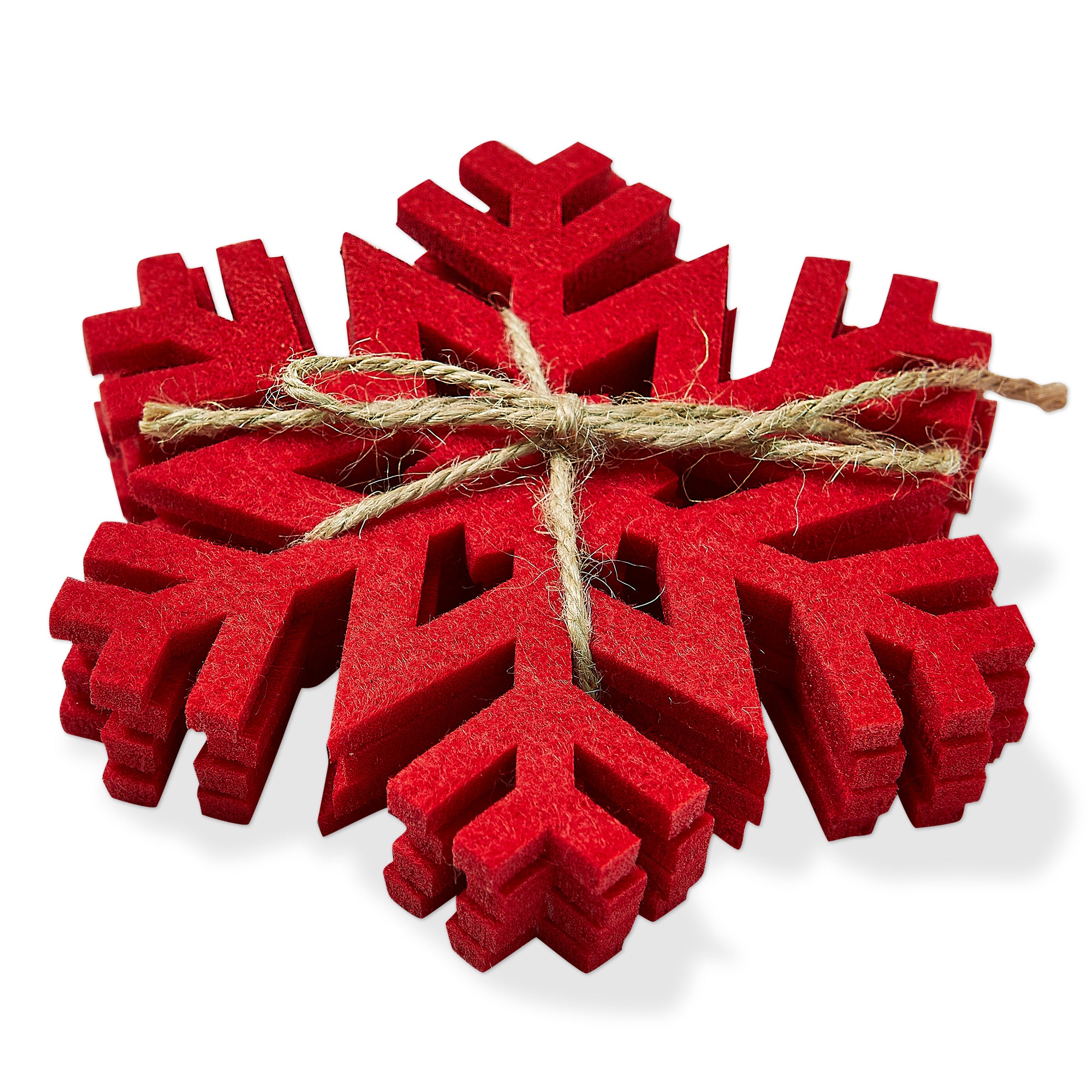 Add a festive touch to any table with this set of four snowflake coasters. They're perfect for protecting any surfaces from spills and adding a holiday touch to any decor.