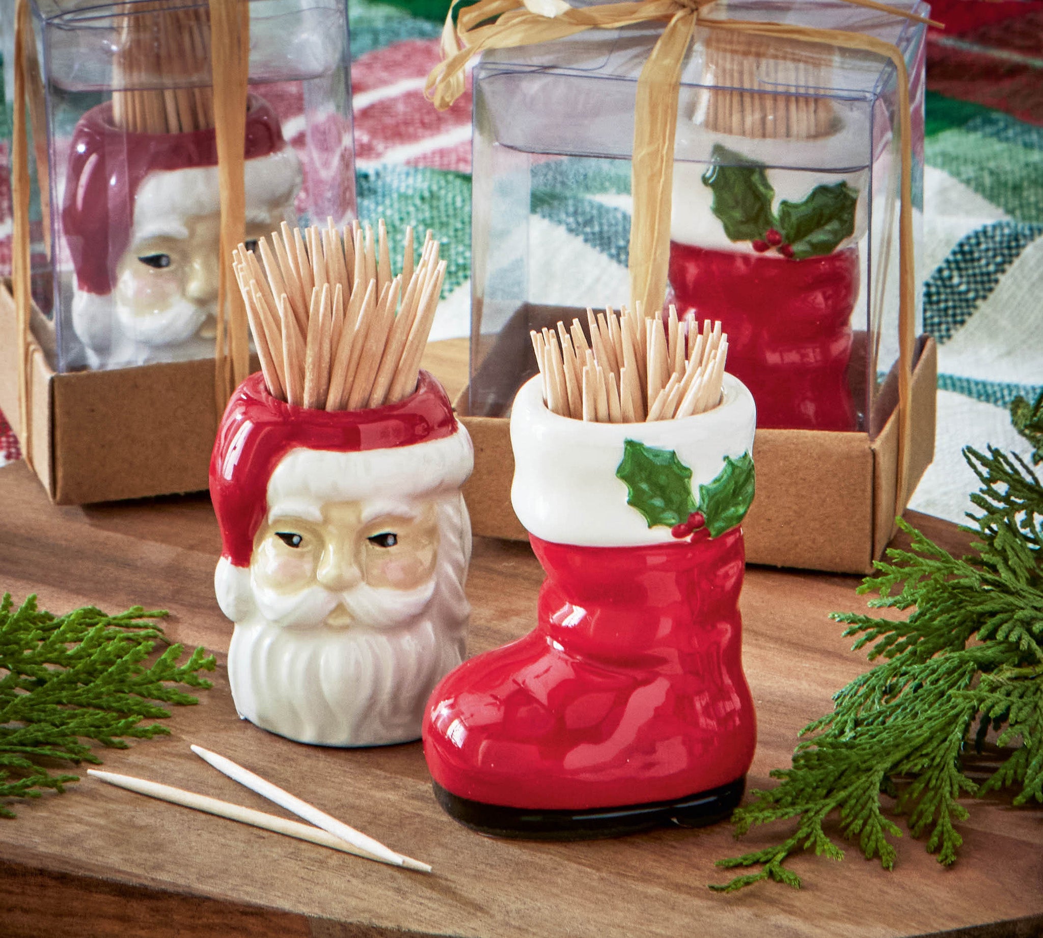 Festive toothpick holders with hand-painted designs. holds 80 bamboo toothpicks, keeps them clean and accessible. perfect for gifting and mixing with other entertaining pieces.