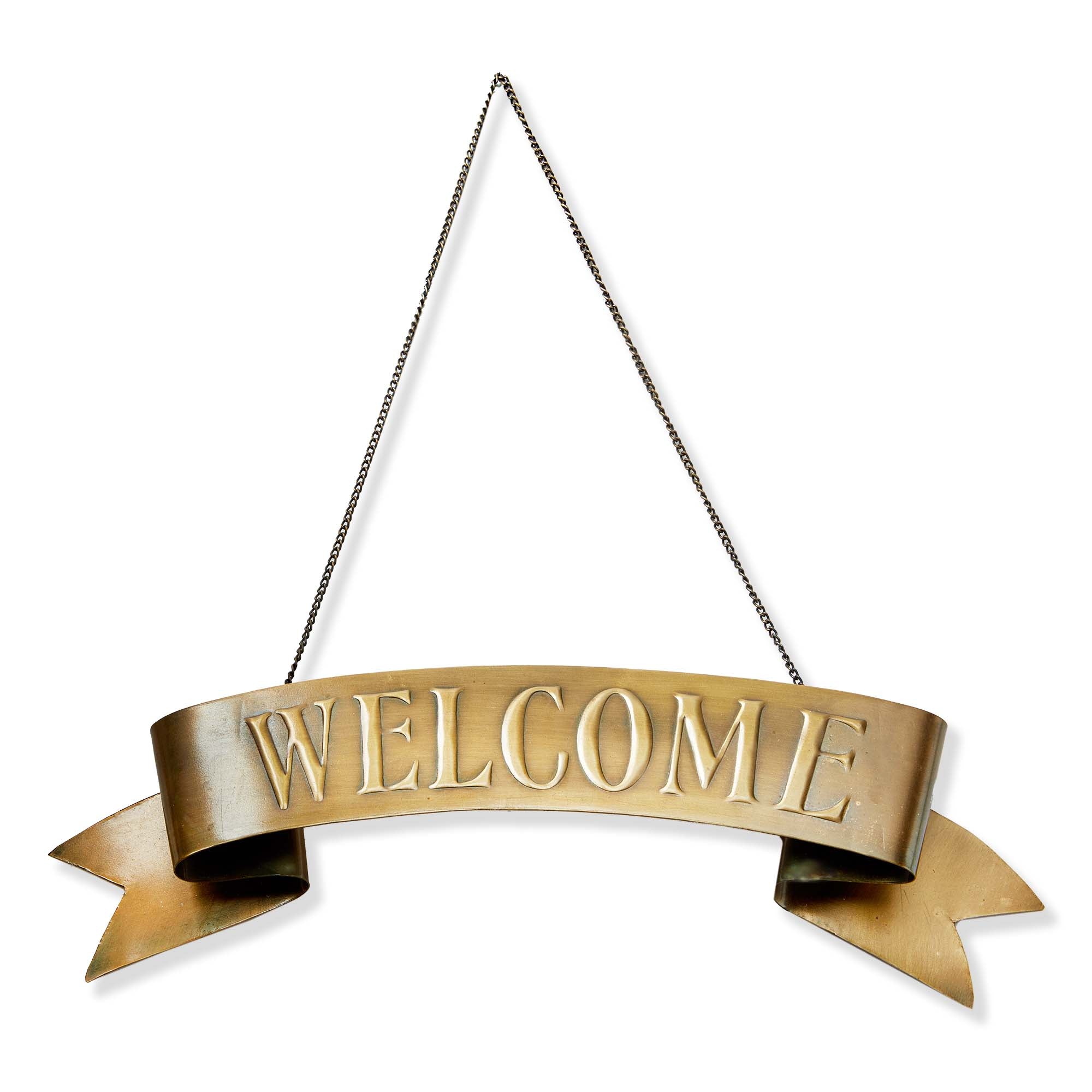 Welcome guests to your home with this classic Welcome Hanging Door Sign. Made from iron with an antique brass finish, this sign is the perfect addition to your entryway.
