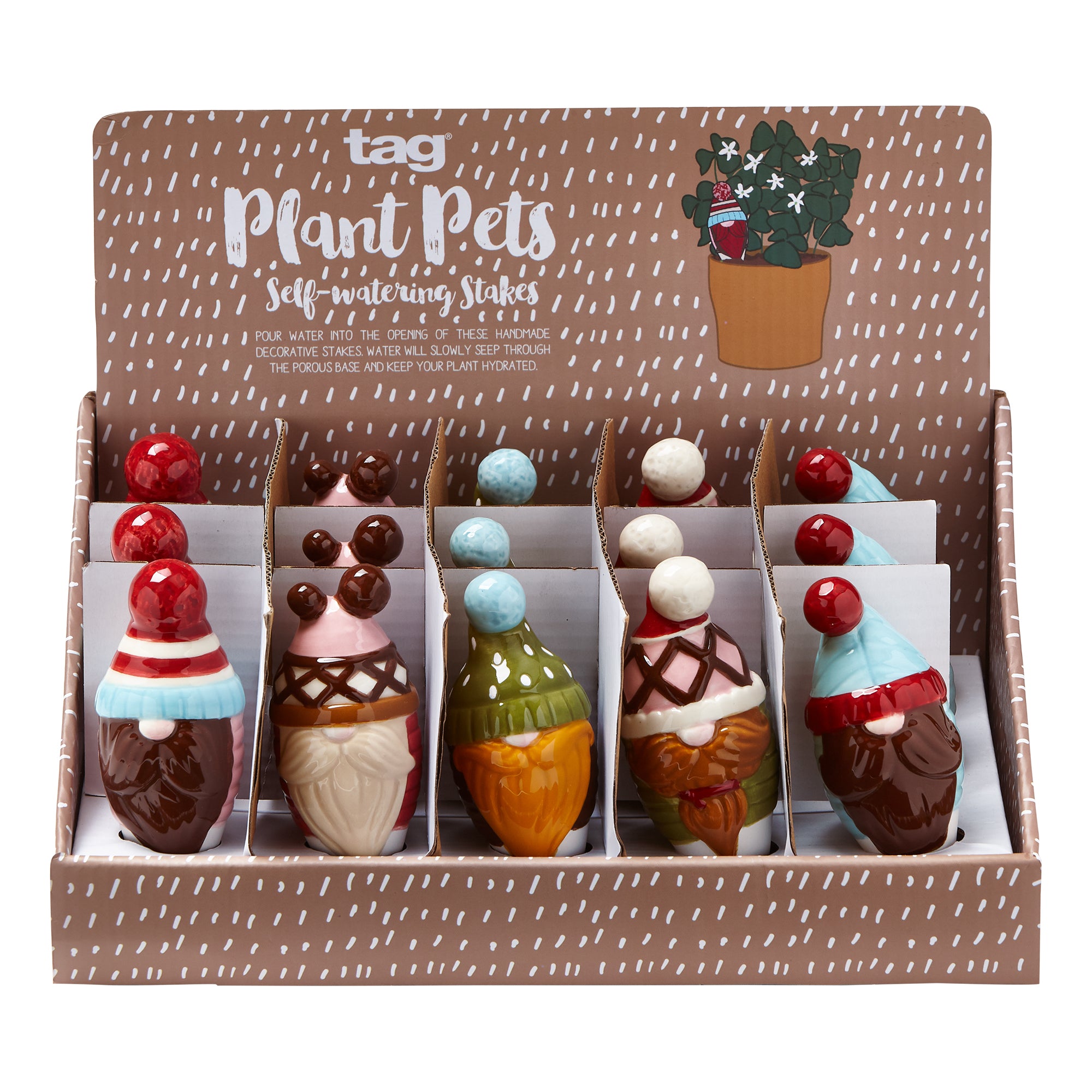 Even your plants should be festive for the holiday. adorable and functional rolled into one, these gnomes will work hard to keep your plants hydrated! just add water into the opening, and it will slowly seep down through the base. each features a porous stake, designed for self-watering. this assortment includes 3 each of 5 sculpted designs featuring a transparent glaze. perfect gift for the plant lovers in your life.