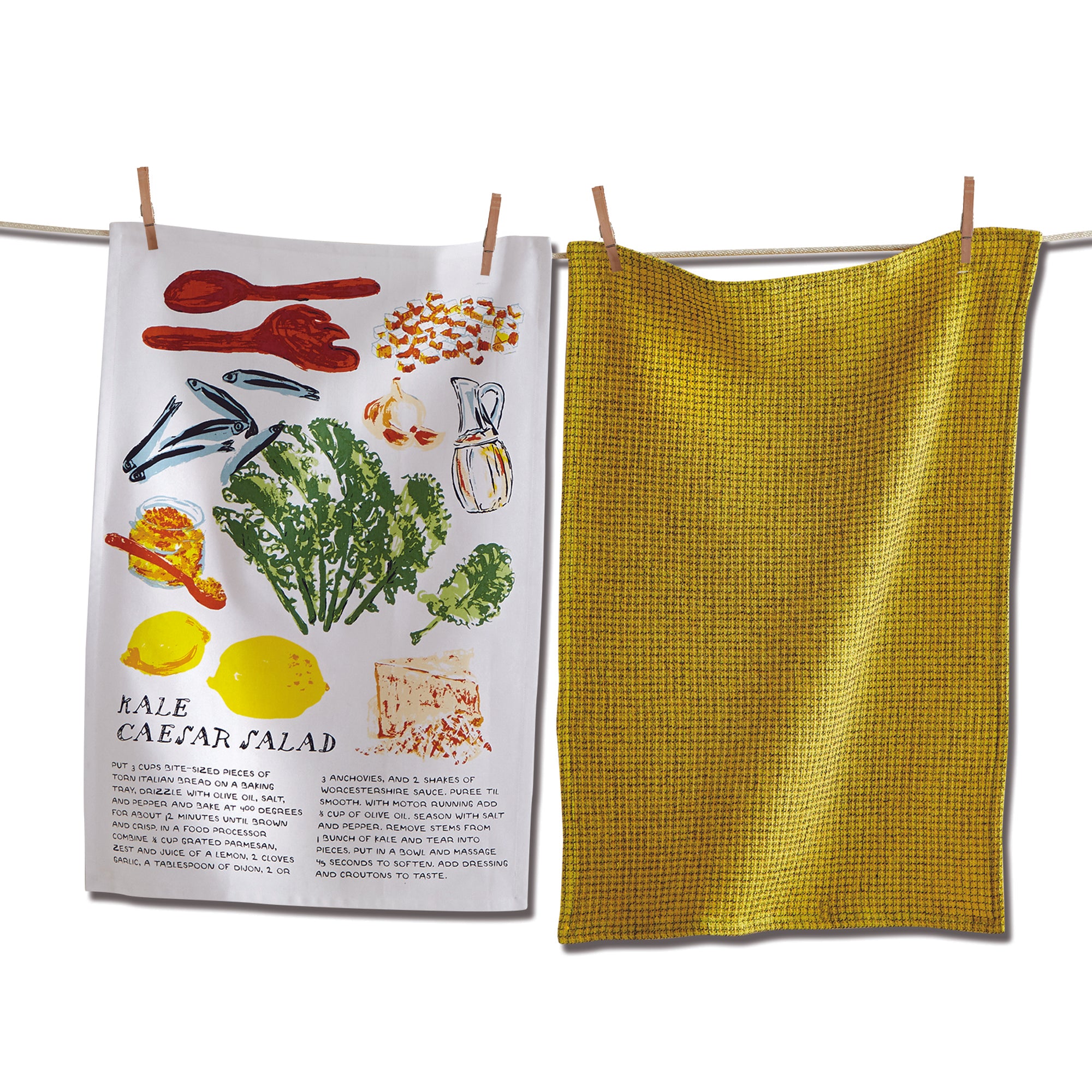 Update your kitchen or give these beautiful dishtowel sets as a gift. 100% cotton, these dishtowels get softer and more absorbent the more they are washed. set includes: one hand screen printed dishtowel with kale caesar salad design on prewashed cotton & one woven waffle weave with twisted yarn packaged in a kraft crate. machine wash cold separately, tumble dry low