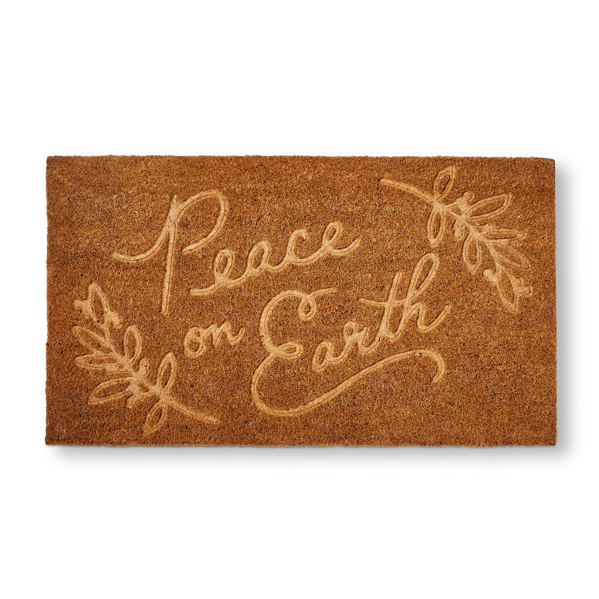 Peace on Earth embossed non slip coir mat featuring a natural finish and seasonal message, perfect for protected outdoor entryways. Hand painted details add warmth while its versatile design makes styling simple. Sized for layered displays and pairs beautifully with seasonal greenery and décor. View all items in Peace on Earth.