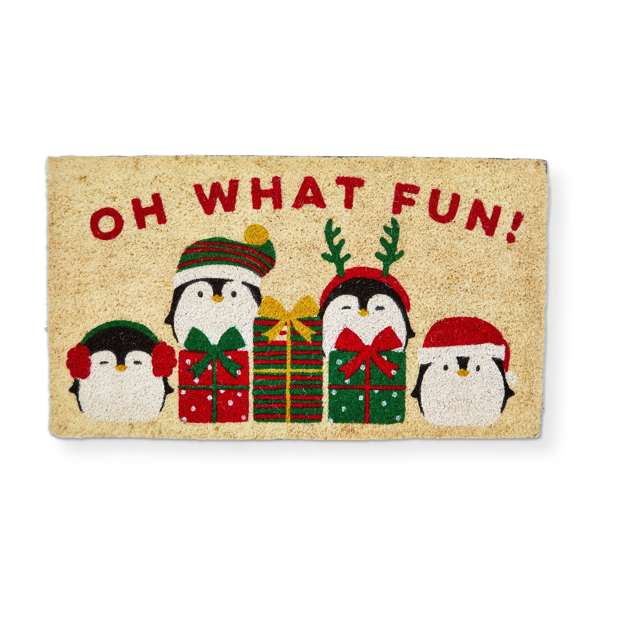 Playful penguin scene on a non slip coir mat keeps dirt outside and spirits high. Best for protected entries. Hand painted details add warmth while its versatile design makes styling simple. Sized for layered displays and pairs beautifully with seasonal greenery and décor. View all items in Holiday Cheer.