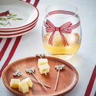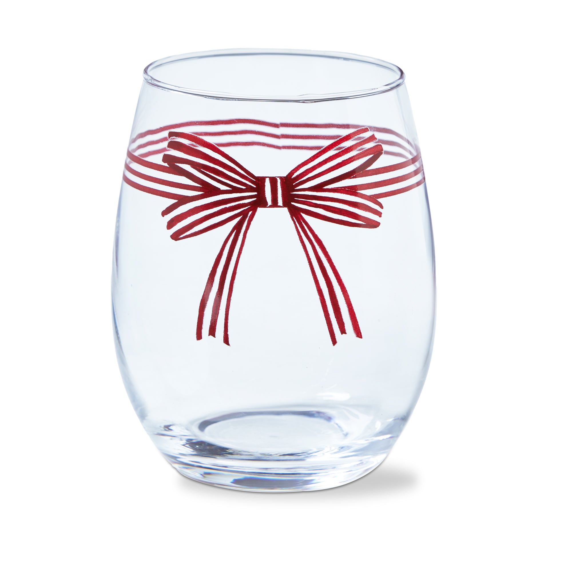Festive stemless wine glass from the Bow collection, finished with bright red holiday accents. Ideal for seasonal toasts, wine gifting, bar carts, and holiday parties. Hand painted details add warmth while its versatile design makes styling simple. Sized for layered displays and pairs beautifully with seasonal greenery and décor. View all items in Winter Berries.