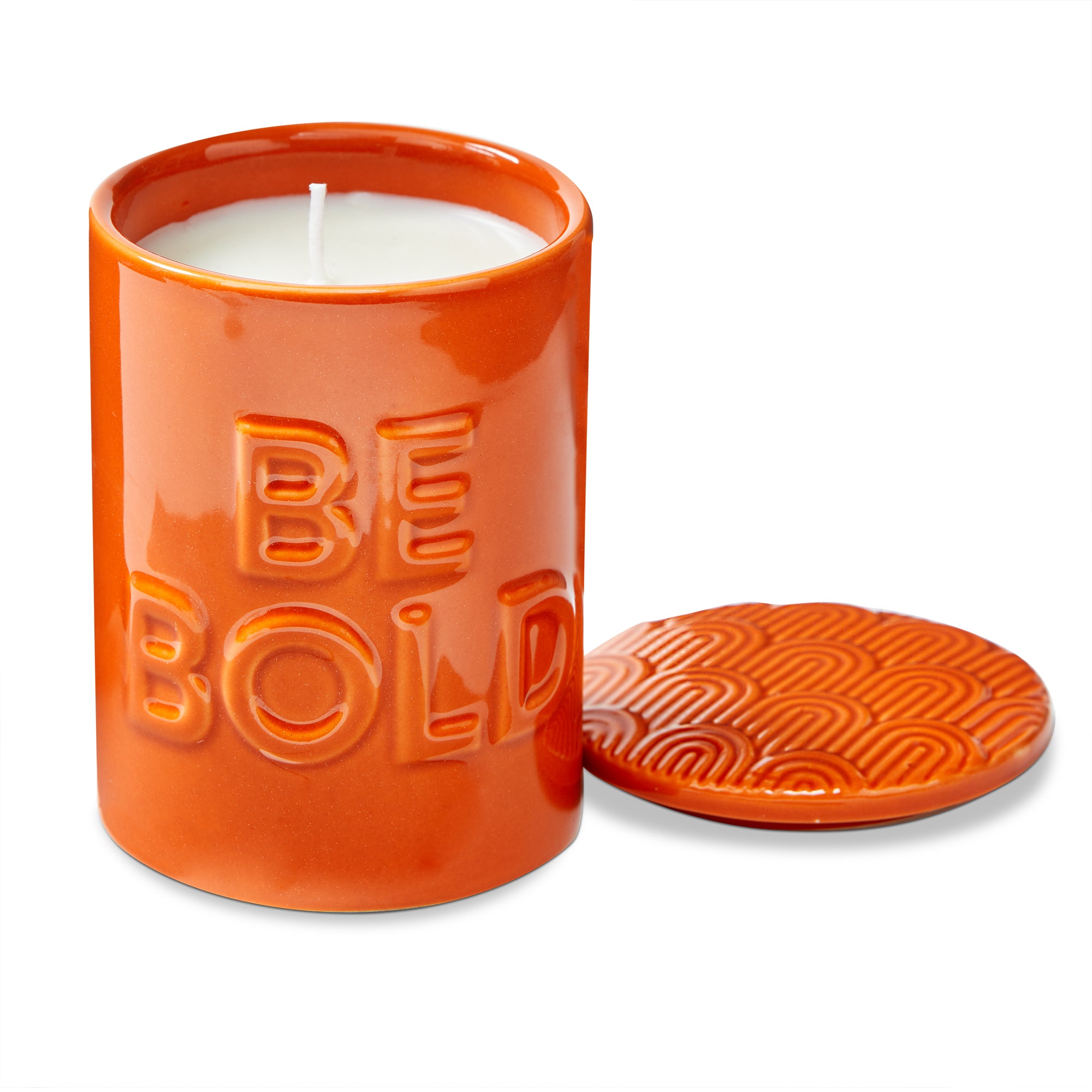The Be Bold Candle with Striker features an orange ceramic jar with inspirational text and a matching lid striker for easy lighting.