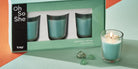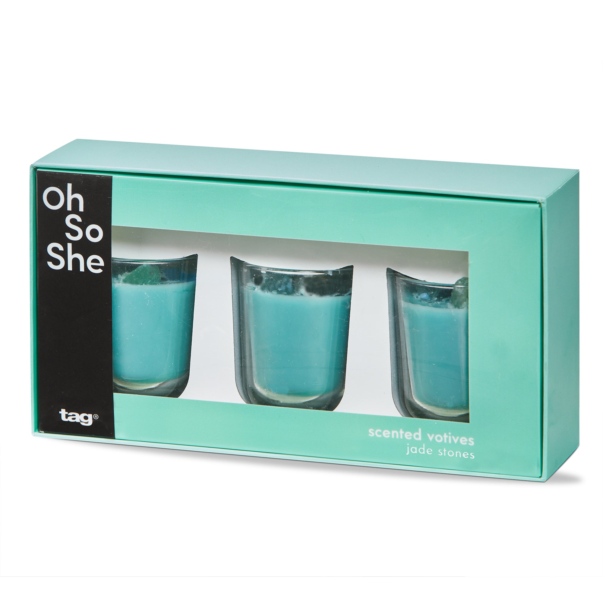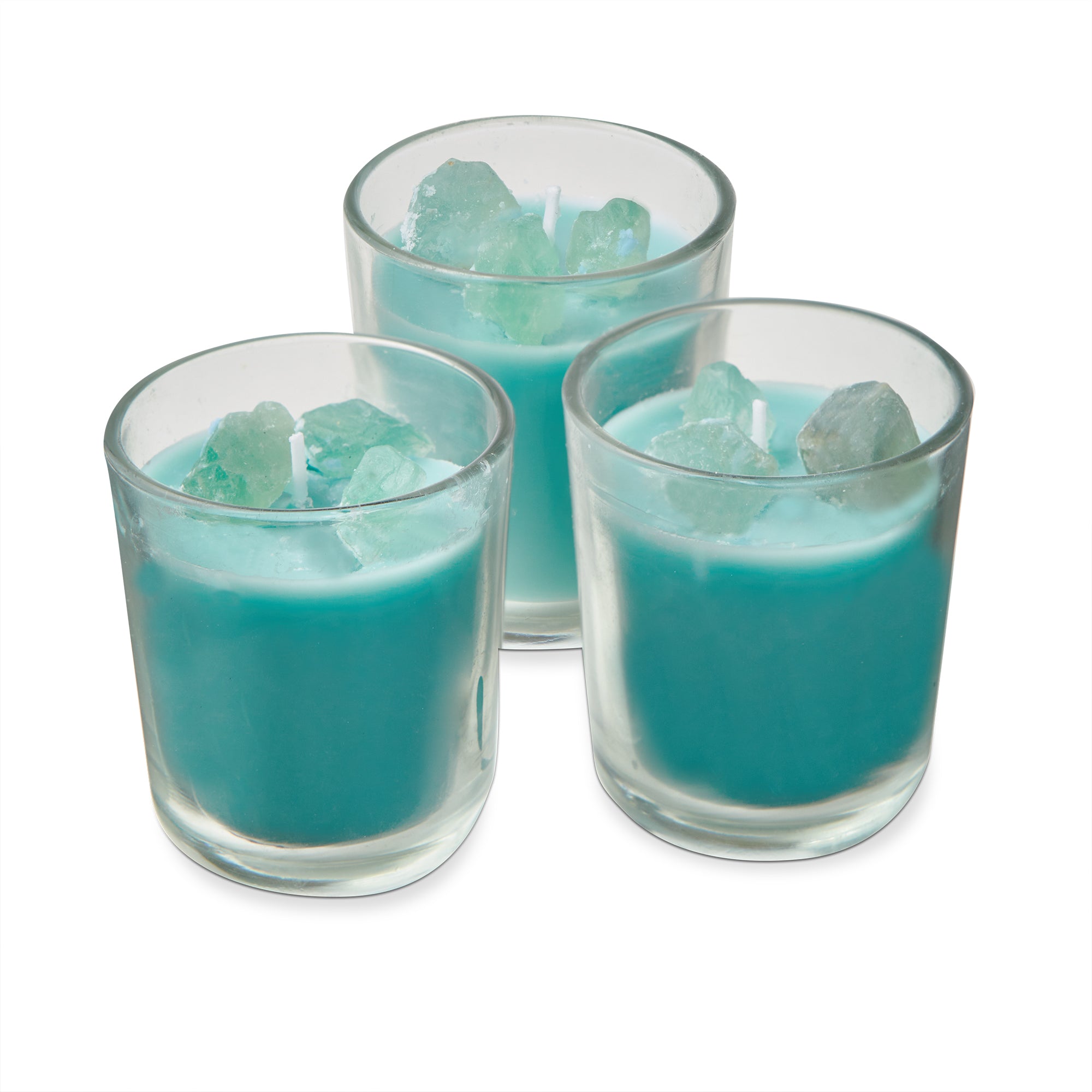 The Scented Votive with Jade Stones Set of 3 features aqua soy wax candles paired with jade stones for a calming touch.
