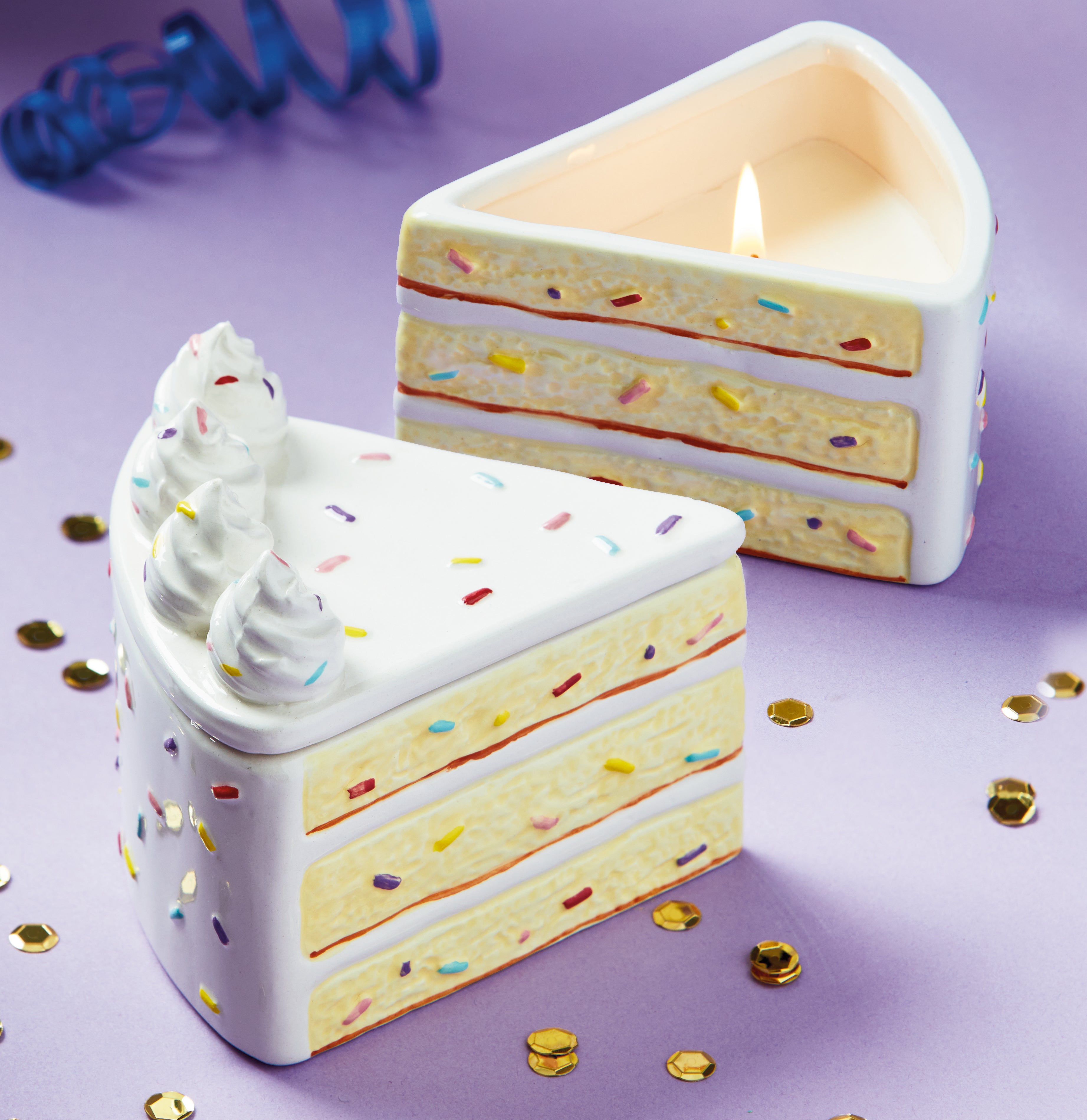 This soy wax candle is sculpted to look like a slice of vanilla cake with frosting. Features a cotton wick and fragrance notes of vanilla cream, vanilla, milky coconut, and caramel.