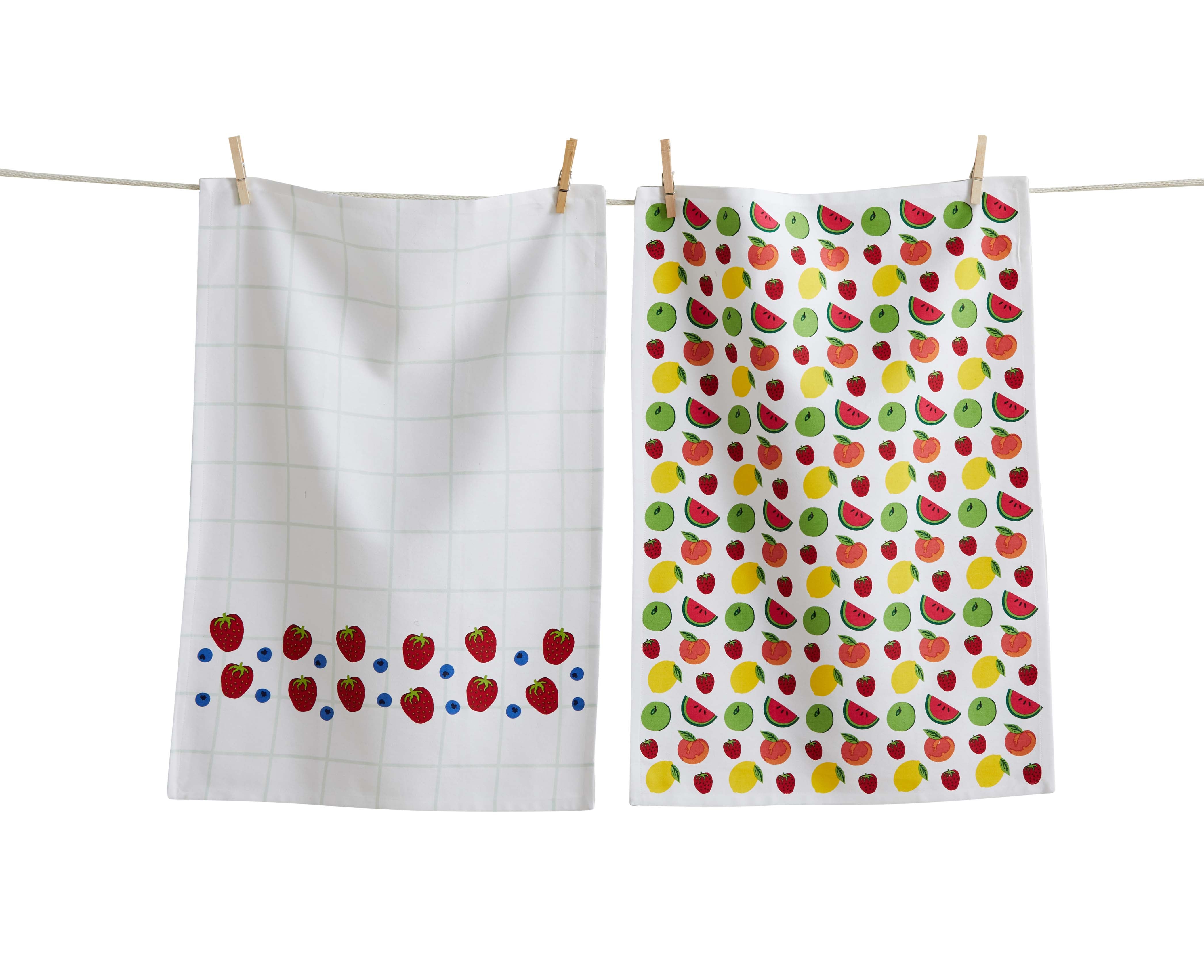 This set of two cotton dishtowels includes one full of fresh fruit and another with a checkered background featuring strawberries and blueberries, both with convenient hang loops.