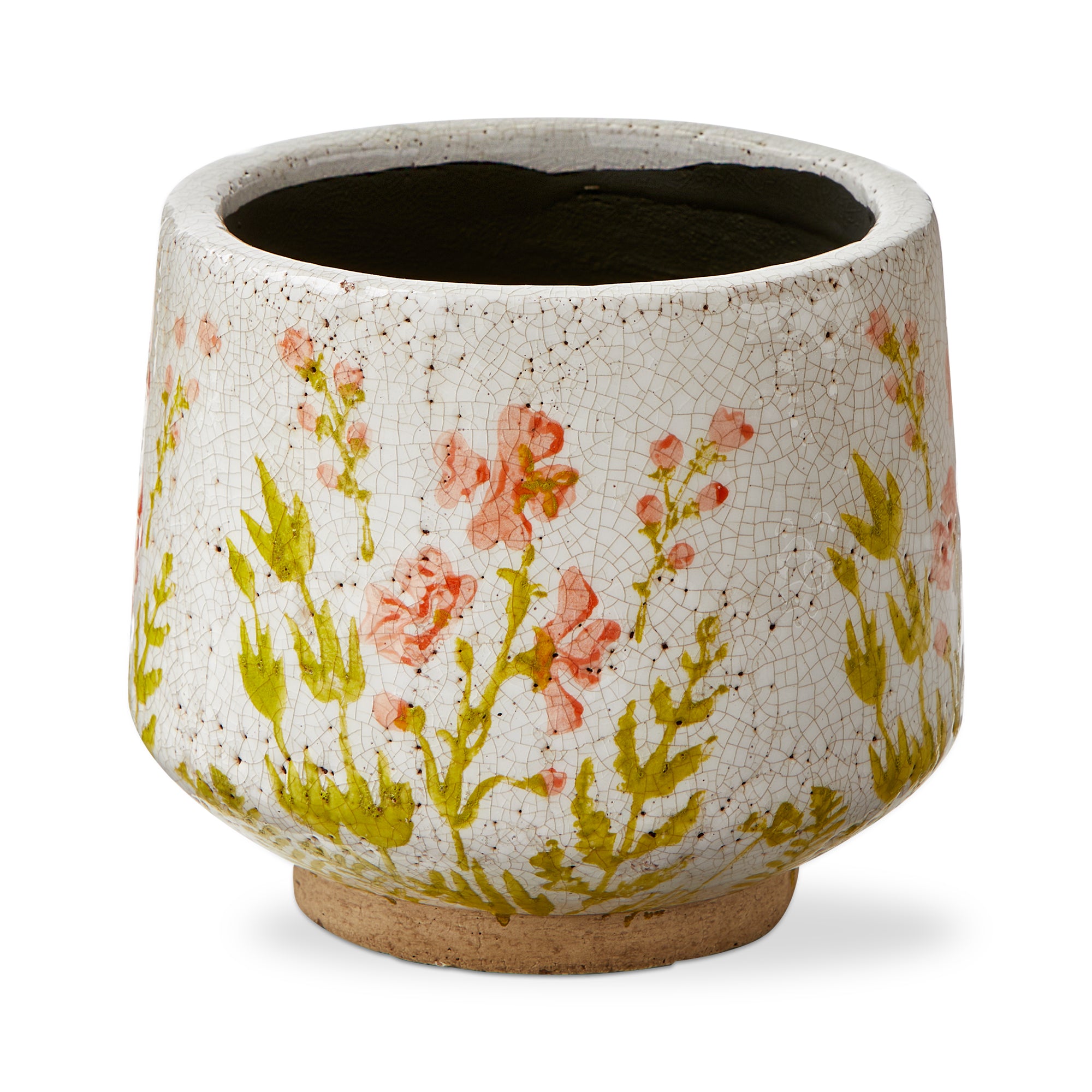 This medium terracotta footed planter features a beautiful wild flower design, a crackle glaze, hand-stamped details, and an exposed terracotta base. Includes a silicone plug and a bottom center drain hole. Holds up to a 5" drop-in pot.
