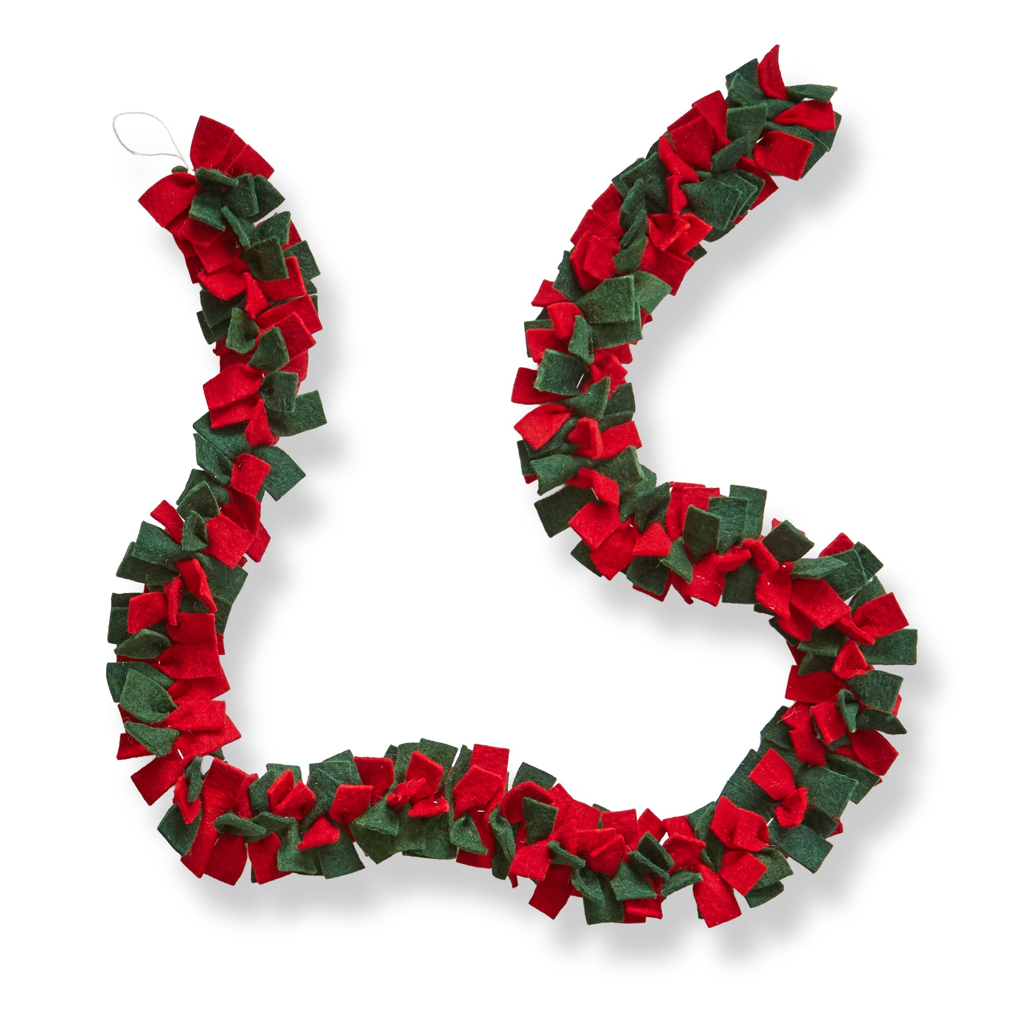 Knotted felt garland crafted from wool in soft greens with loops for easy hanging. Adds cozy texture to mantels, stair rails or holiday trees and brings warm handcrafted charm to seasonal decorating. Hand painted details add warmth while its versatile design makes styling simple. Sized for layered displays and pairs beautifully with seasonal greenery and décor. View all items in Wonderful Christmastime.