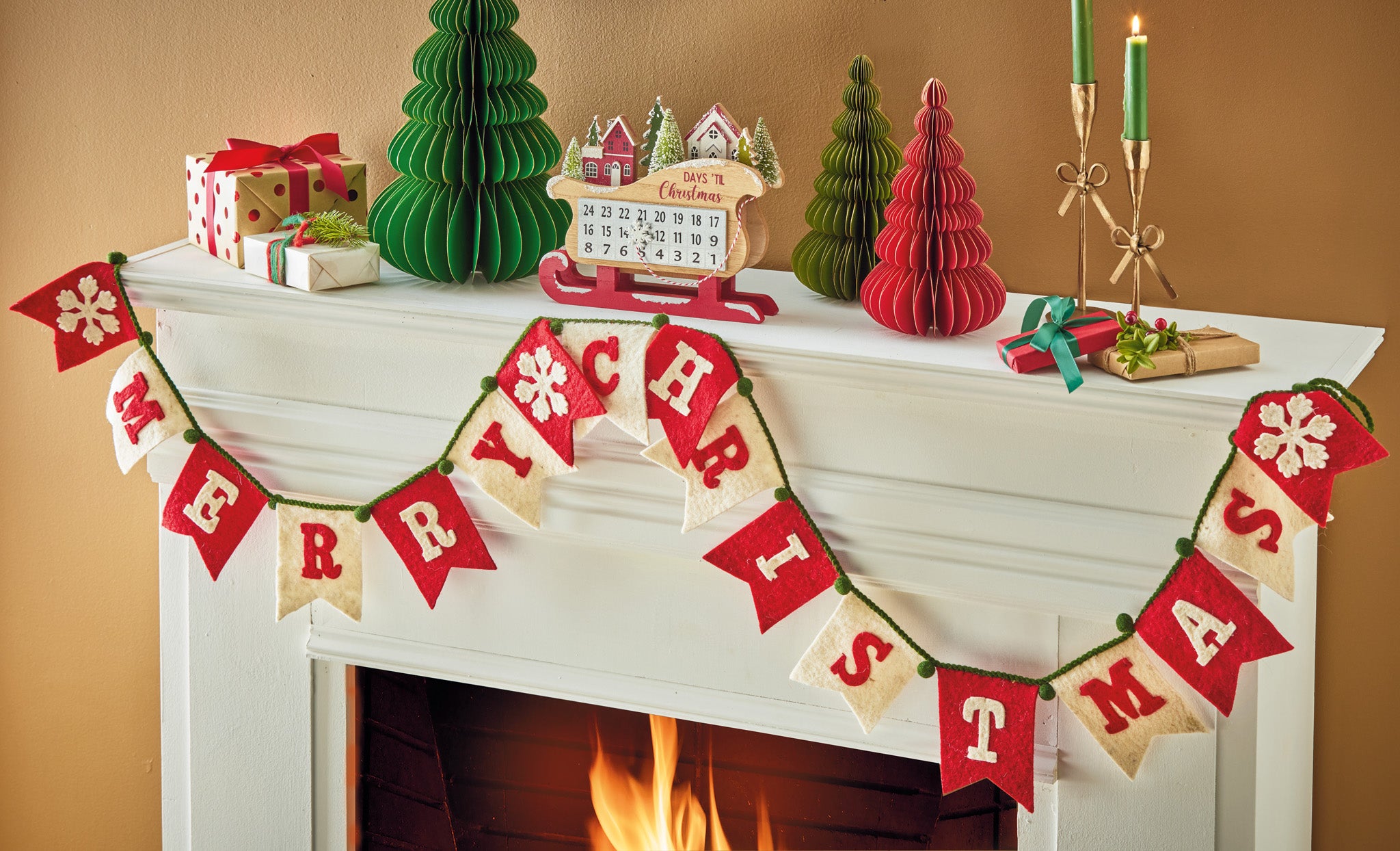 Merry Christmas felt garland spells out a message with snowflakes for cheerful hanging decor and instantly dresses up mirrors mantels and entryways. Hand painted details add warmth while its versatile design makes styling simple. Sized for layered displays and pairs beautifully with seasonal greenery and décor. View all items in Wonderful Christmastime.