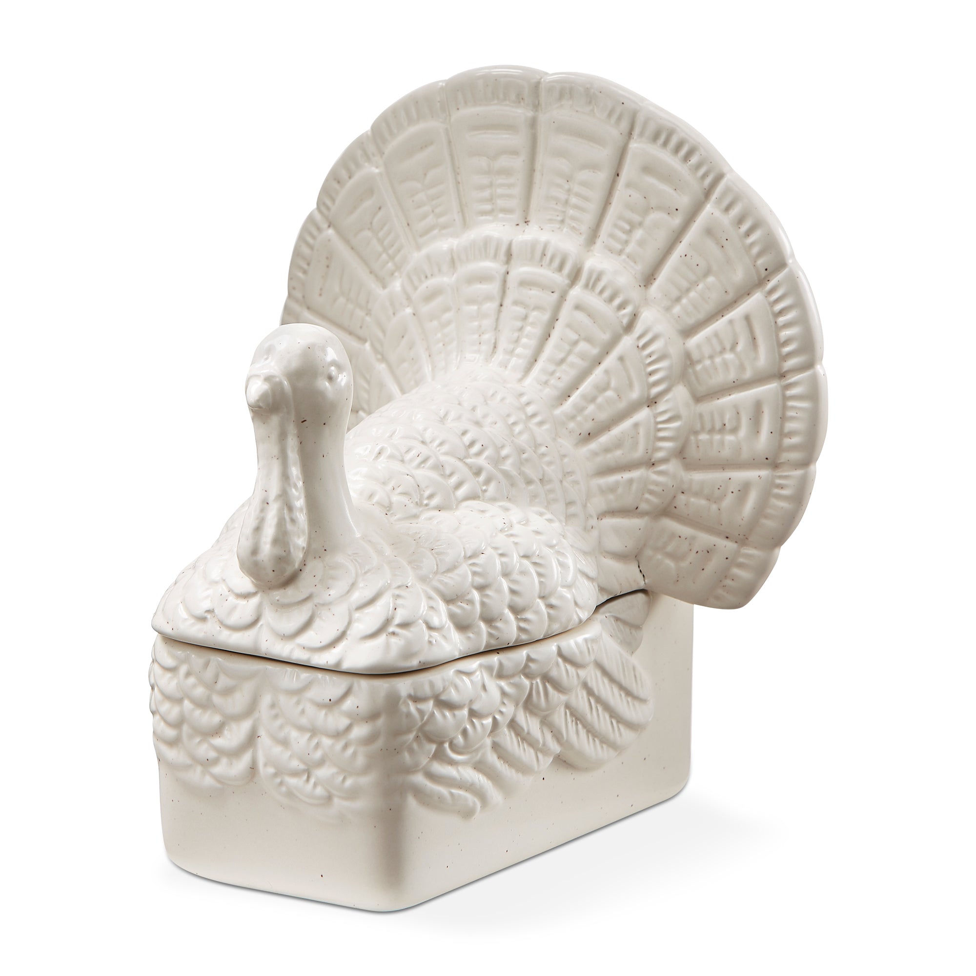Set the thanksgiving scene with our turkey butter dish, the perfect addition to your fall tablescapes. this is a wonderful two-part butter dish in creamy white earthenware, generous enough in size to hold european butter. this fine feathered turkey can also be filled with holiday treats or be used simply as autumn table art. gobble, gobble!