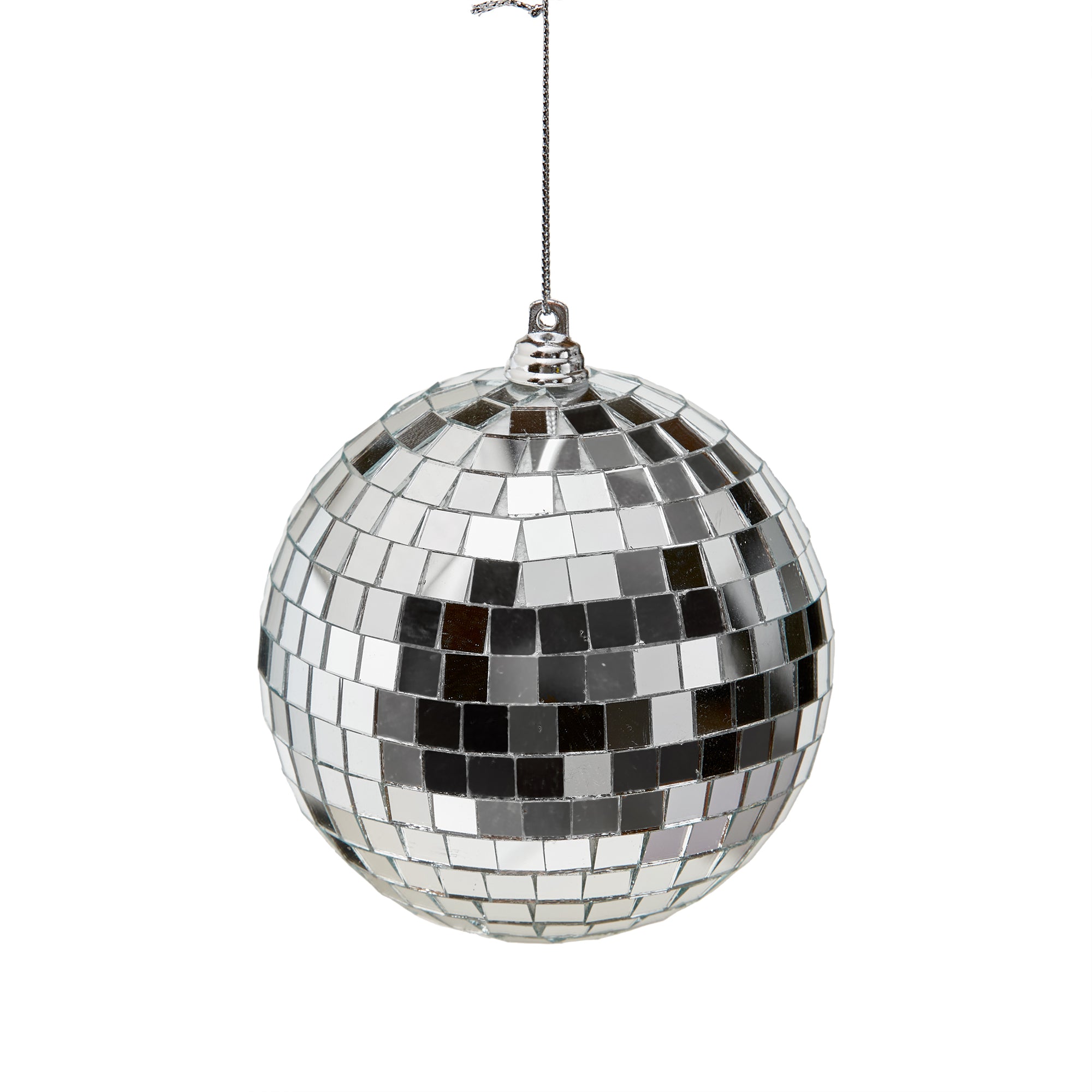 Silver groovy disco ball ornament offers classic mirror ball shine for party ready trees and looks striking grouped in bowls or hung from chandeliers. Hand painted details add warmth while its versatile design makes styling simple. Sized for layered displays and pairs beautifully with seasonal greenery and décor.