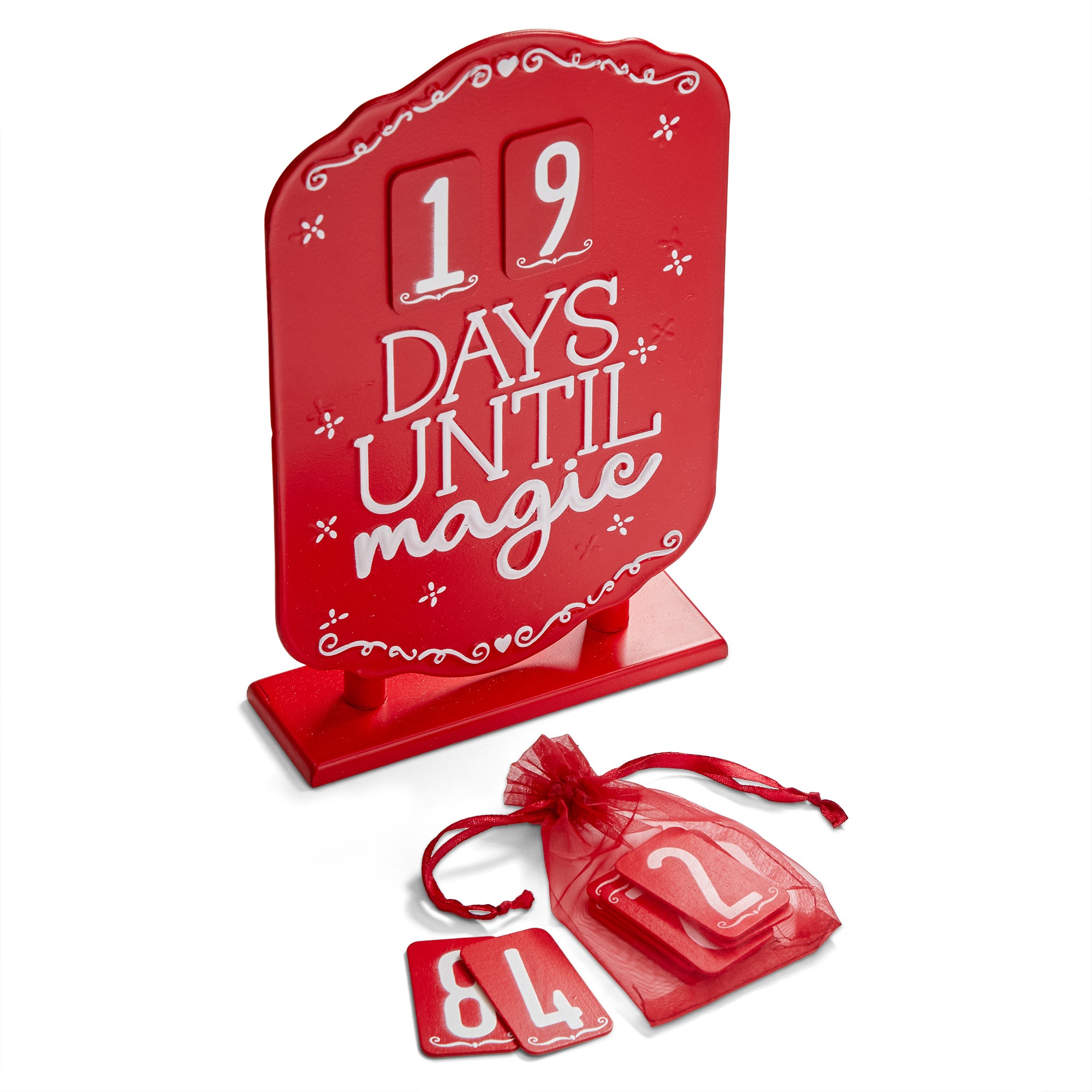 Magnetic countdown sign that tracks the days until magic with movable numbers. Bright red artwork and easy read numbers make this a family favorite near entryways or kitchens. Hand painted details add warmth while its versatile design makes styling simple. Sized for layered displays and pairs beautifully with seasonal greenery and décor. View all items in Holiday Cheer.