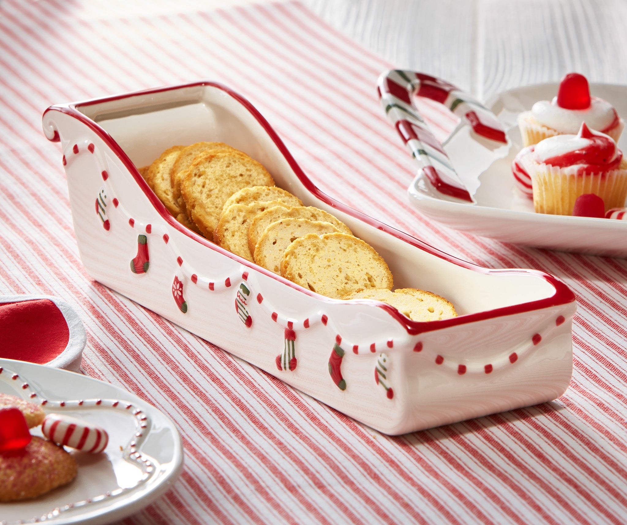 Add a touch of festive fun to your holiday table with this charming Holiday Cheer Sleigh Cracker Dish. Crafted from earthenware, this dish features a festive sleigh design with a red border and stockings, perfect for serving crackers or other small treats. View all items in Holiday Cheer.