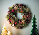 Embrace the traditional spirit of Christmas with this classic Holiday Pinecone Wreath. This wreath features pinecones, red berries, and red ornaments.