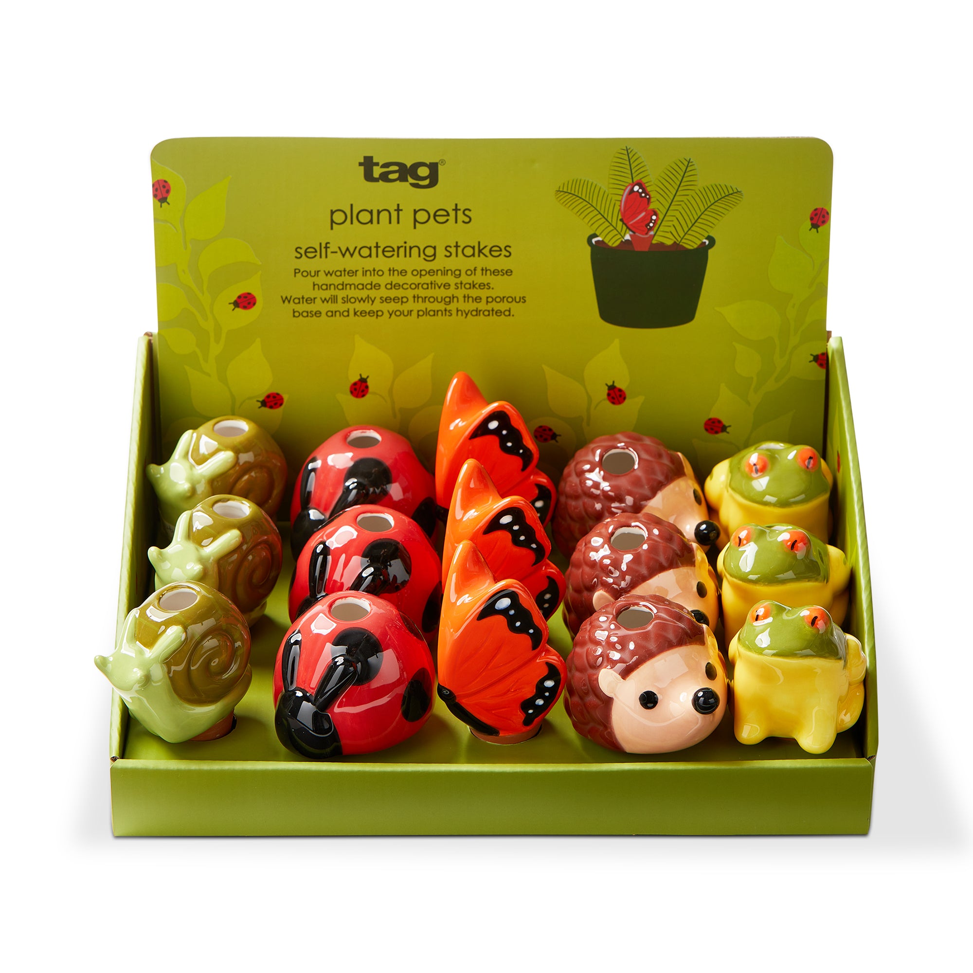 This CDU assortment includes 15 hand-sculpted and hand-painted plant pets. The porous, unglazed stake allows water to seep out, keeping your plants hydrated. Assortment includes 3 each of 5 sculpted designs: snail, ladybug, butterfly, hedgehog, frog.