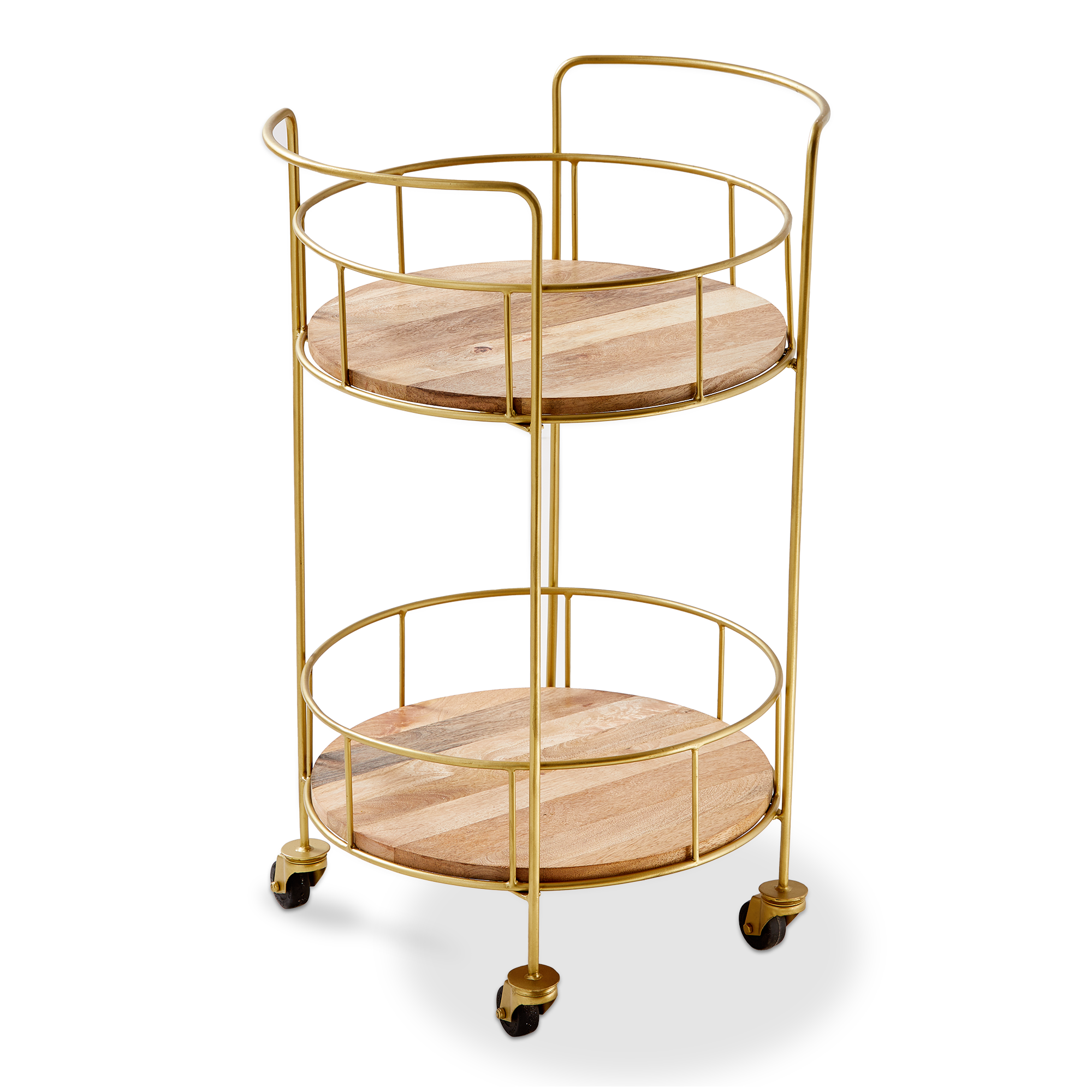 The perfect bar cart for smaller spaces! This circular design in brass-finished iron and wood features two shelves to hold your drinks and glassware. Equipped with castor wheels for easy movement around your home.