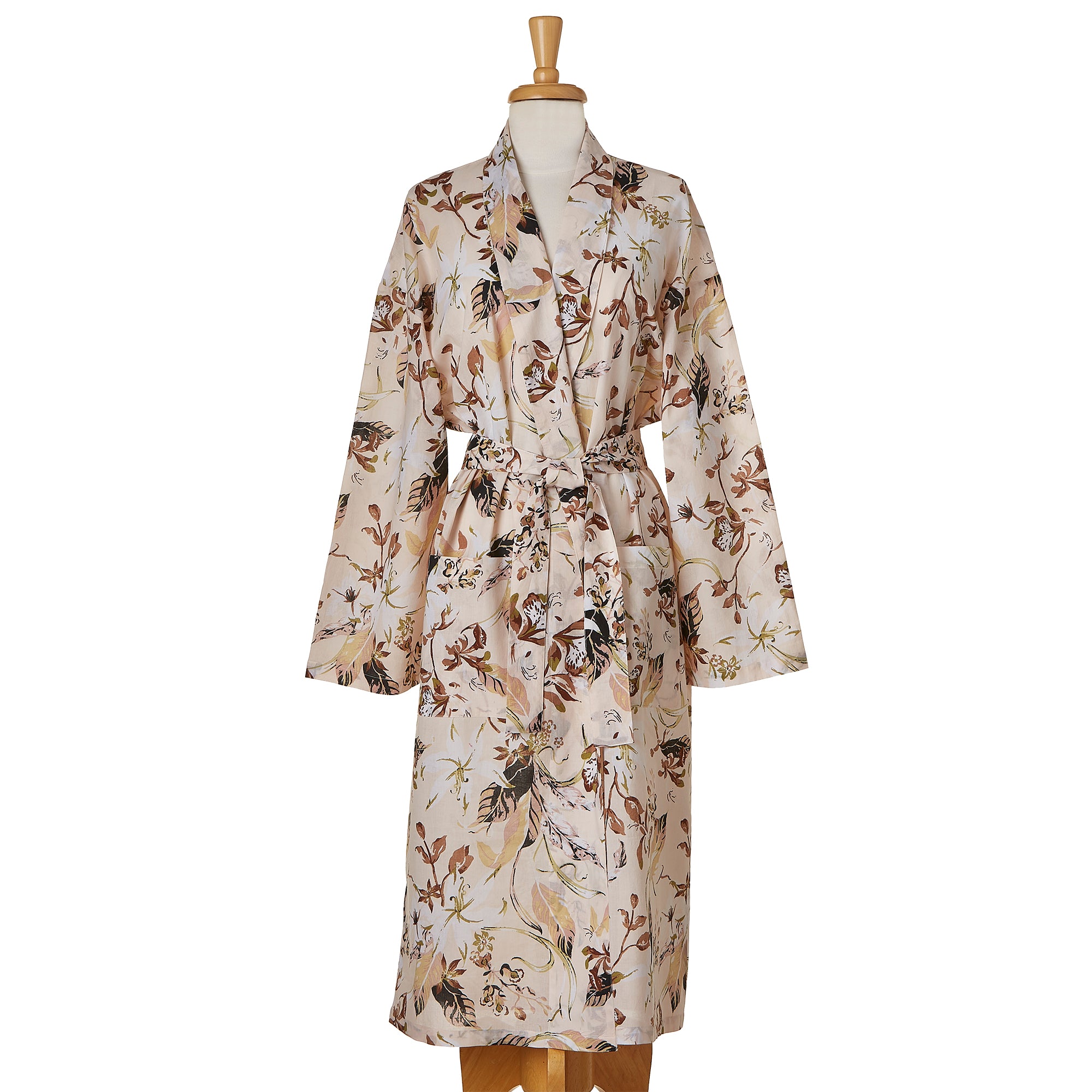 Bring the elegance of the spa experience home! Feel oh so pretty in our stylish artisan-made robe. Features hand screen discharge print, waist tie, two pockets, and beautiful tag exclusive artwork. One size.