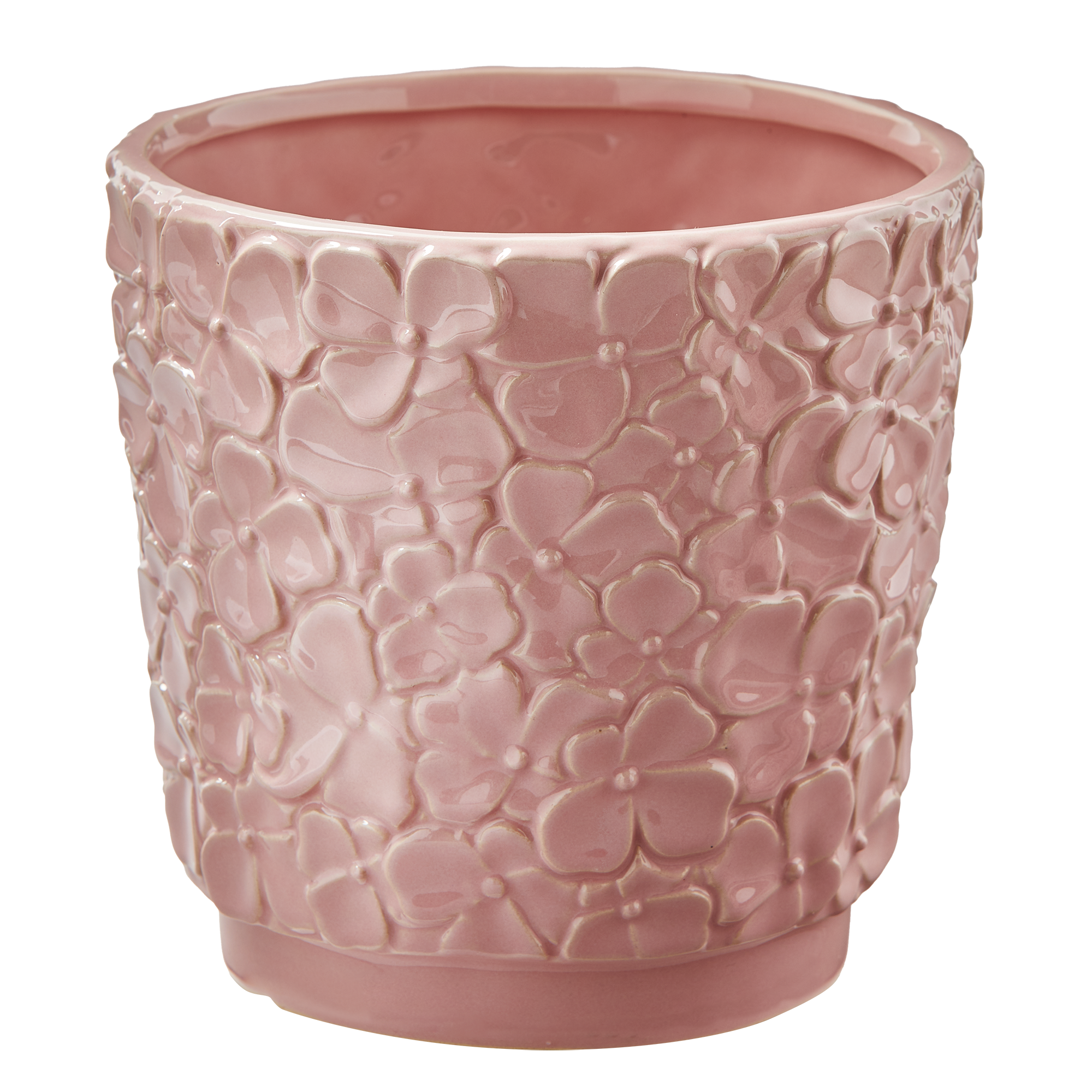This large pink stoneware planter features a sculpted blossom design and a reactive glaze finish. Includes a silicone plug and a bottom center drain hole. Holds up to a 6" drop-in pot.