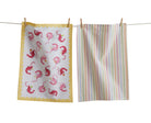 Set of two cotton dishtowels: one hand screen-printed satin weave featuring cute pink shrimp drinking cocktails, and one yarn-dyed woven dobby stripe with multiple colors.
