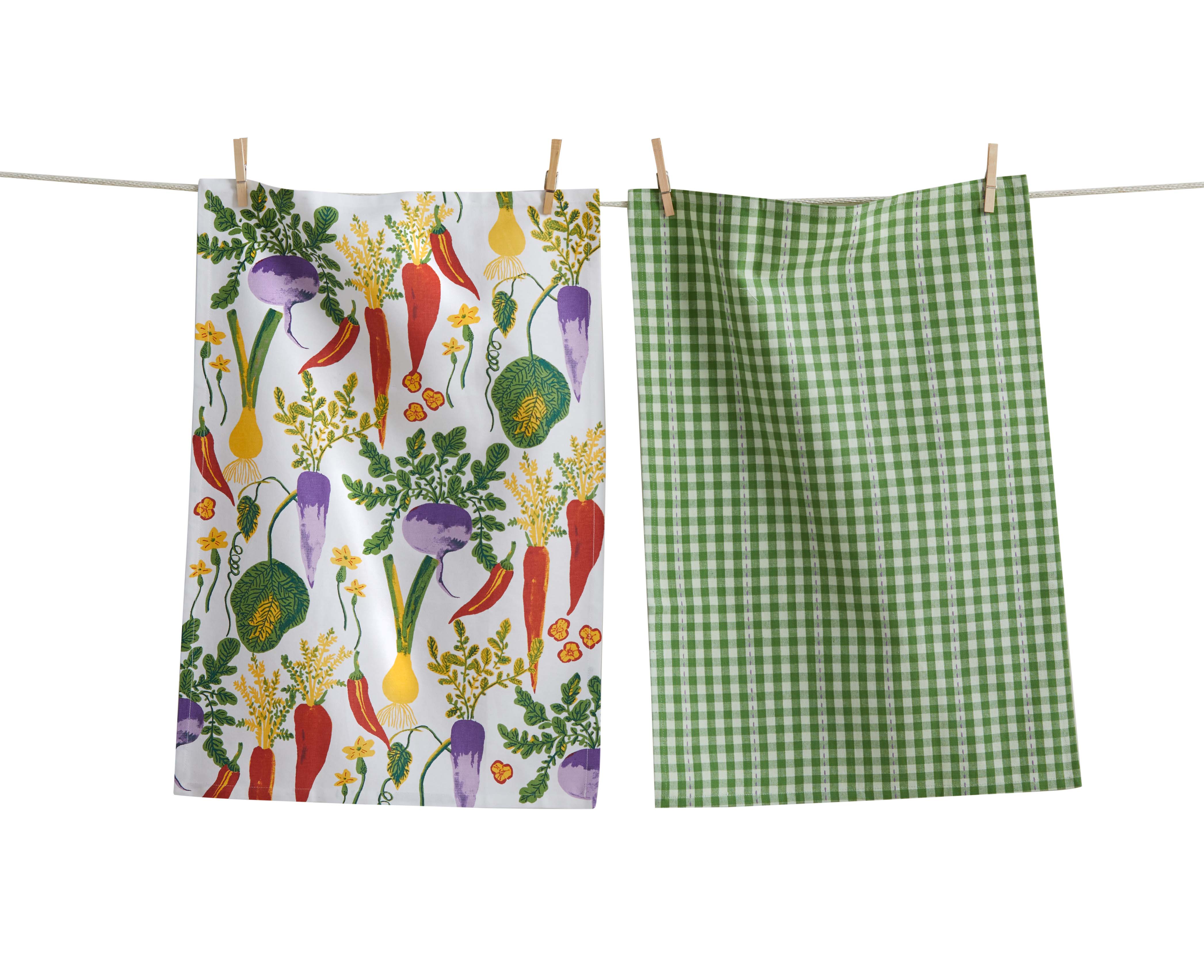Instant dopamine décor for veggie lovers and gardeners! This set includes one green and yellow check cotton dishtowel and one printed with various vegetables, both with hang loops.
