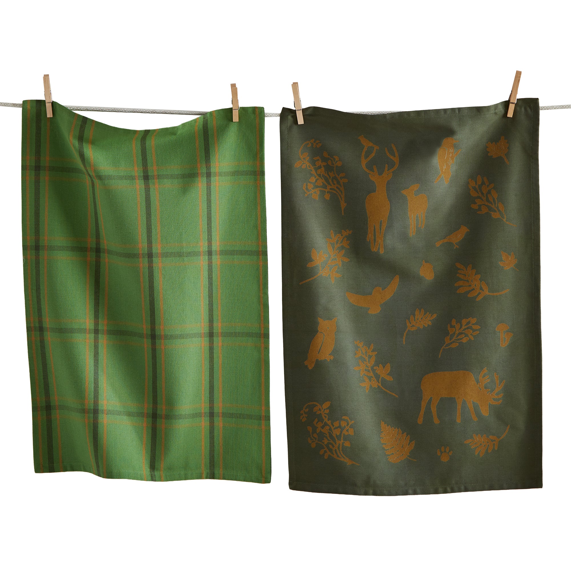 Animals dishtowel set combines a playful animal scene with coordinating plaid giving everyday kitchens a hint of woodland story charm. Hand painted details add warmth while its versatile design makes styling simple. Sized for layered displays and pairs beautifully with seasonal greenery and décor. View all items in Northern Forest.