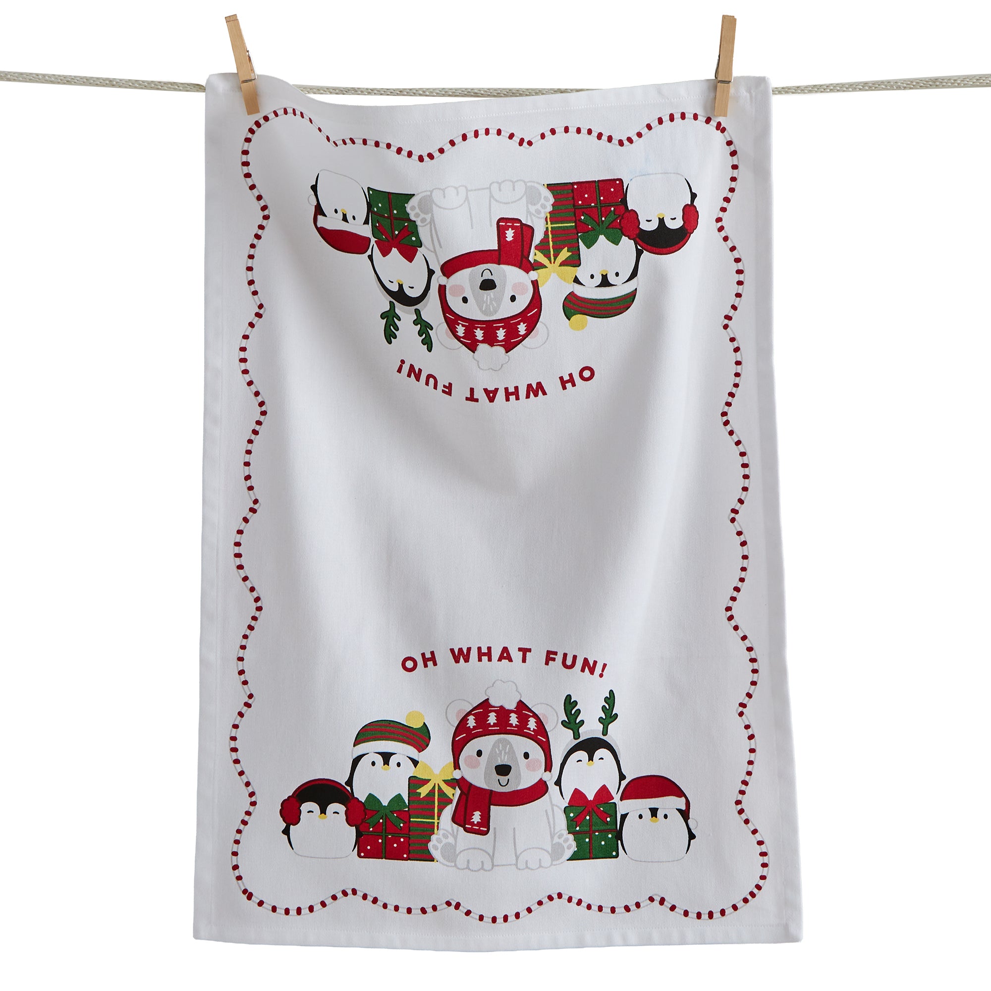 Oh What Fun dishtowel adds playful holiday lettering to the kitchen sink scene and brings a pop of color to oven doors or towel bars. Hand painted details add warmth while its versatile design makes styling simple. Sized for layered displays and pairs beautifully with seasonal greenery and décor. View all items in Holiday Cheer.