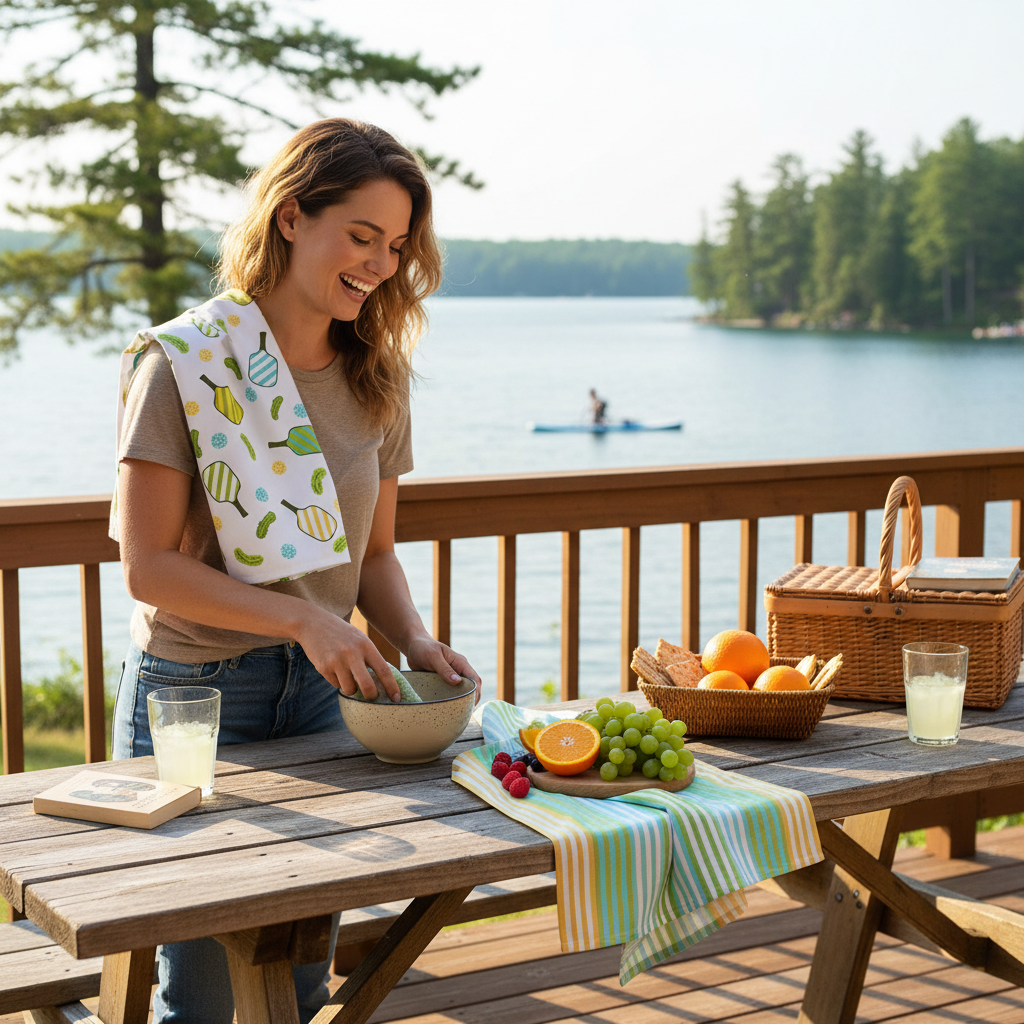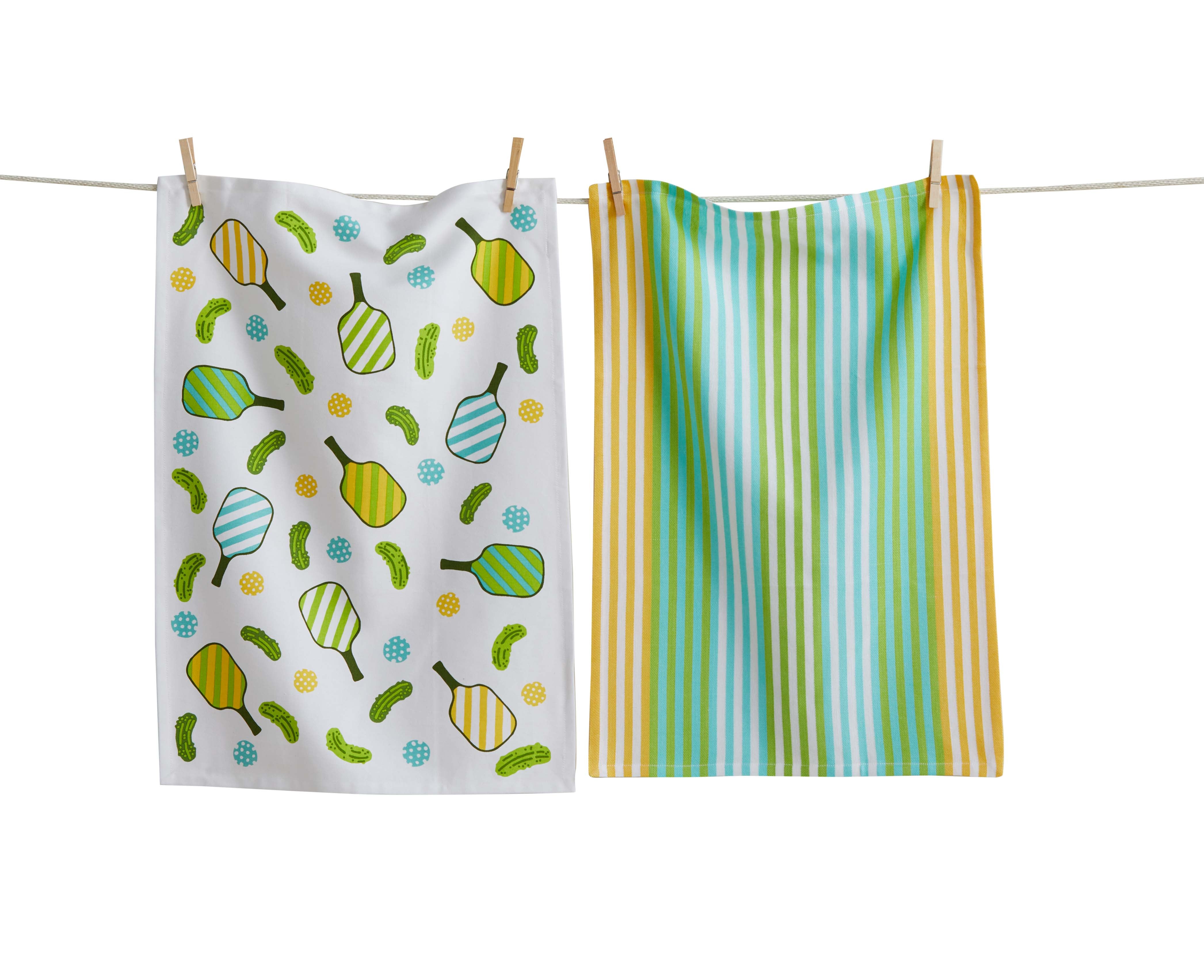 This set of two cotton dishtowels includes one with a fun pickleball print and another with stylish woven stripes, both featuring handy hang loops. A great pick for pickleball enthusiasts! View all items in Loom & Weave.