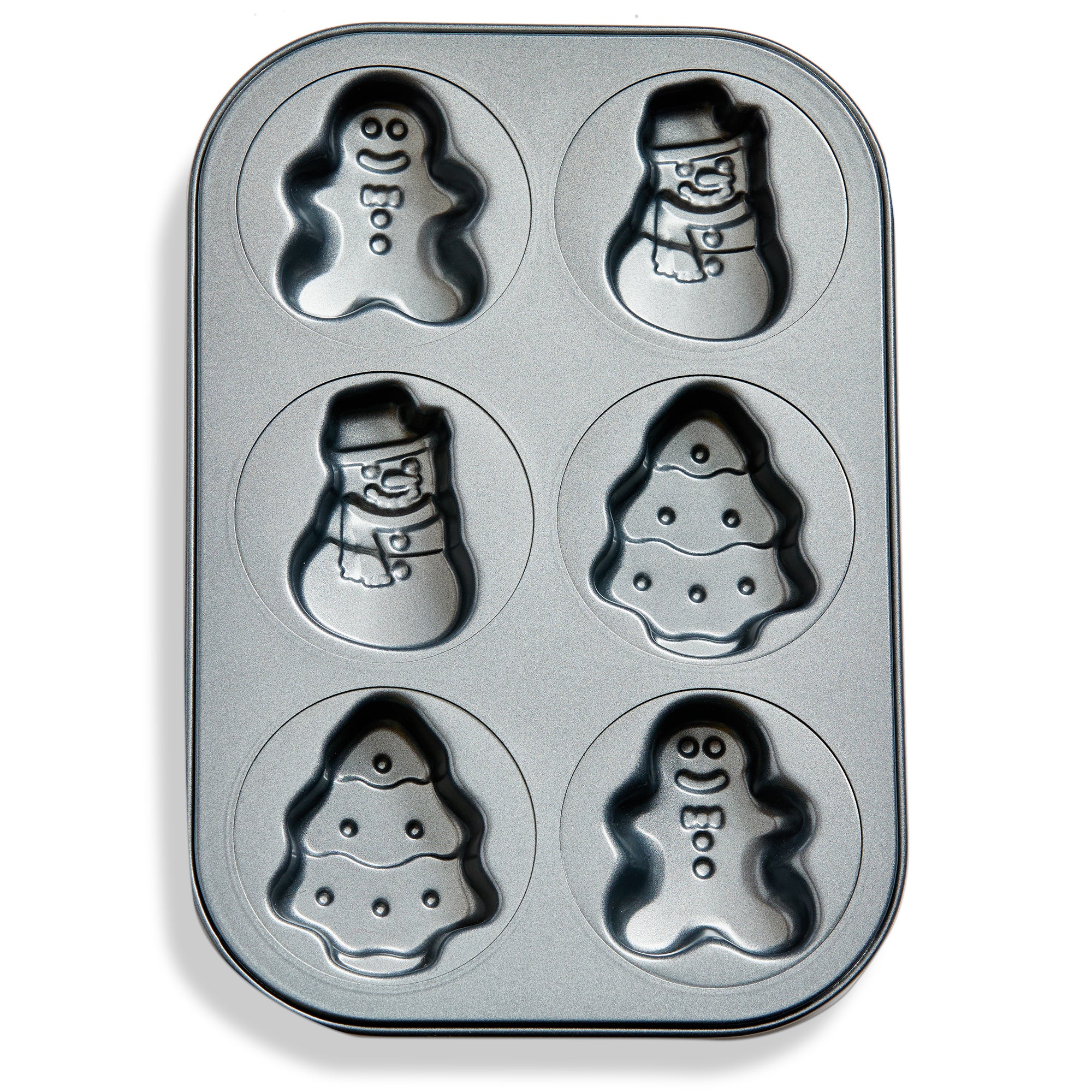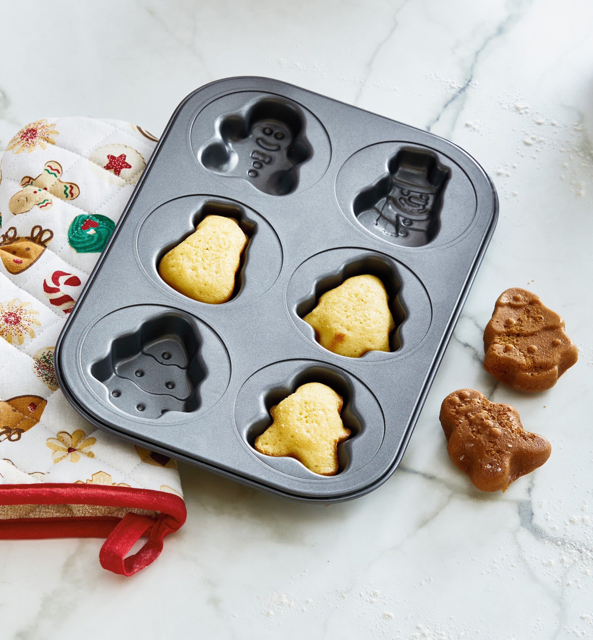 Non stick cakelet pan featuring six holiday shapes including trees and gingerbread. Carbon steel with coating ensures easy release for festive baking every season. Hand painted details add warmth while its versatile design makes styling simple. Sized for layered displays and pairs beautifully with seasonal greenery and décor. View all items in Sweetest Christmas.