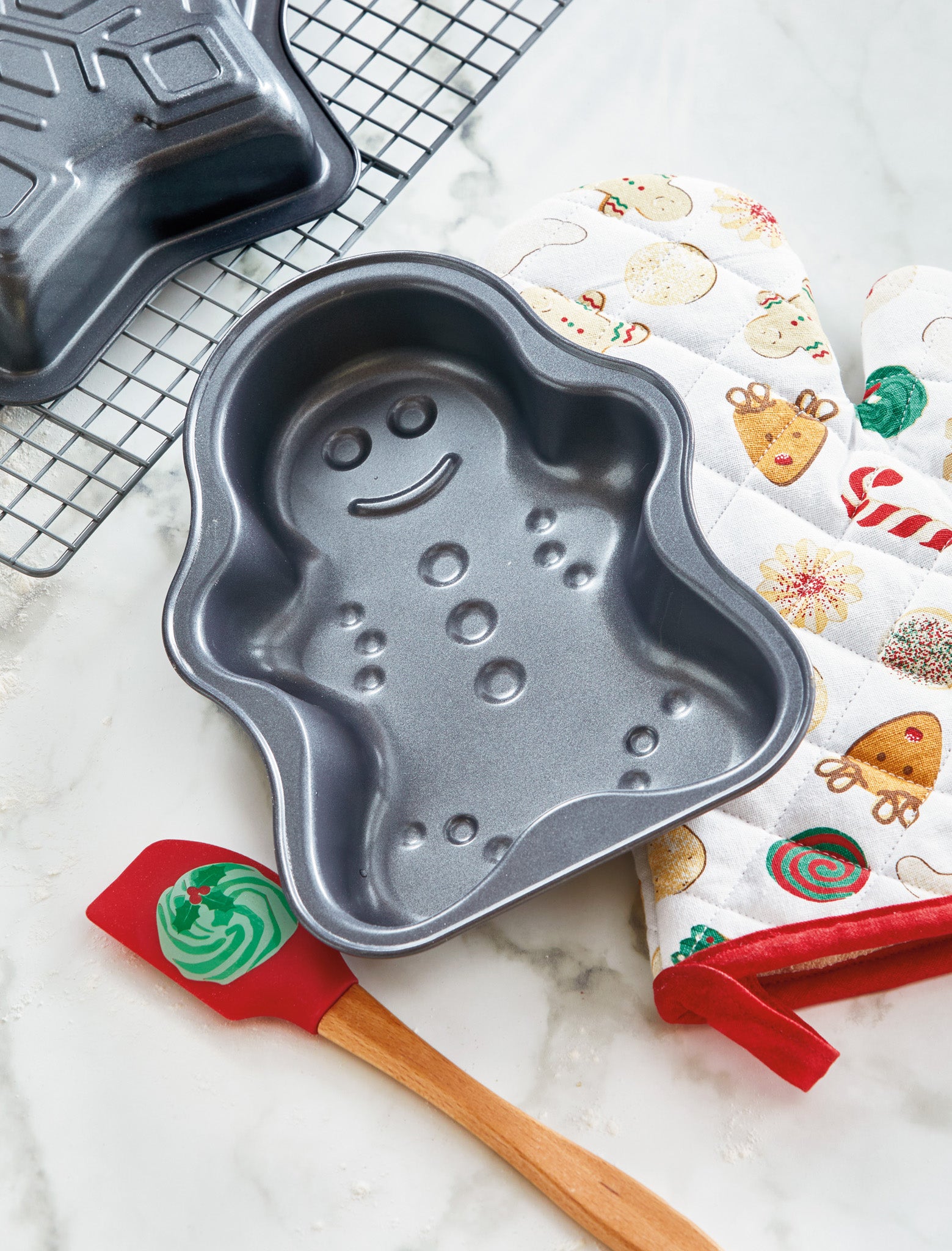 Gingerbread man shaped non stick cake pan. Ideal for holiday baking and festive shaped cakes with easy release and even heating. Hand painted details add warmth while its versatile design makes styling simple. Sized for layered displays and pairs beautifully with seasonal greenery and décor. View all items in Sweetest Christmas.