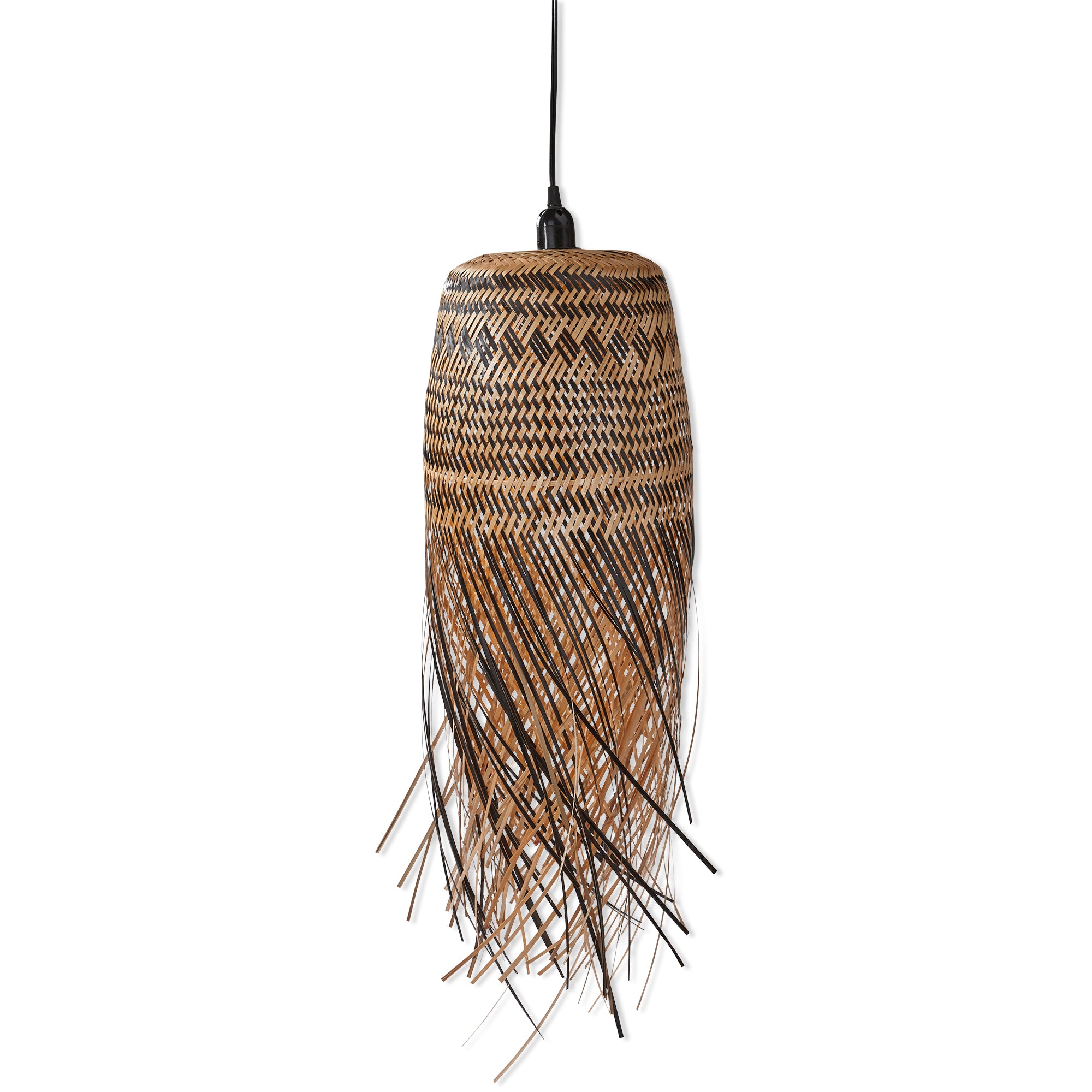 The natural color and warmth of bamboo is perfectly complimented by the airy, open weave of this pendant. perfectly versatile, this piece works well alone, or grouped with our other pendant lighting. add to any corner for an instantly relaxed touch. this piece is artisan-made from hand woven bamboo and requires a 60w screw-in lightbulb.