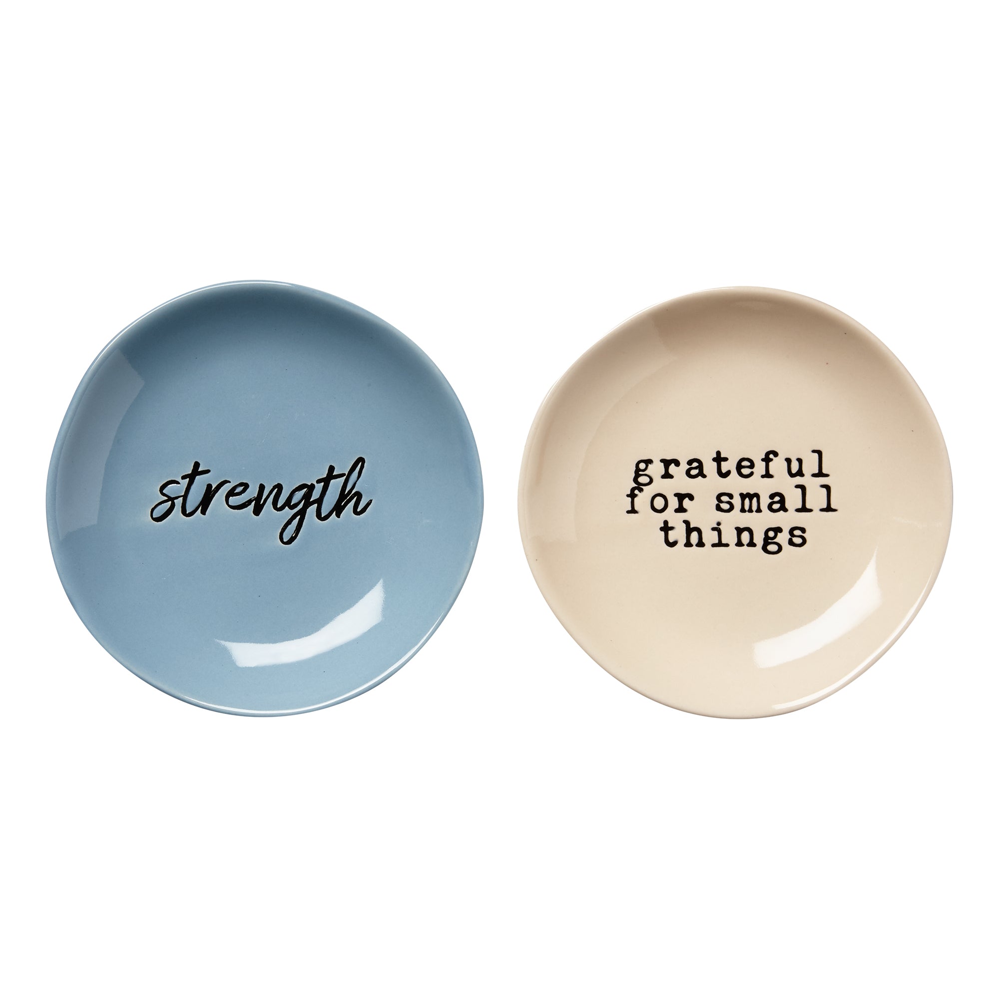 A beautiful assortment of trinket dishes featuring heartfelt notes. made from stoneware with wax resist designs and glossy finishes. use to hold small items like keys, rings, earrings and necklaces. place on side tables or entryways for easy access. each assortment of two features one of each design: "grateful for small things" and "strength". perfect for gifting.