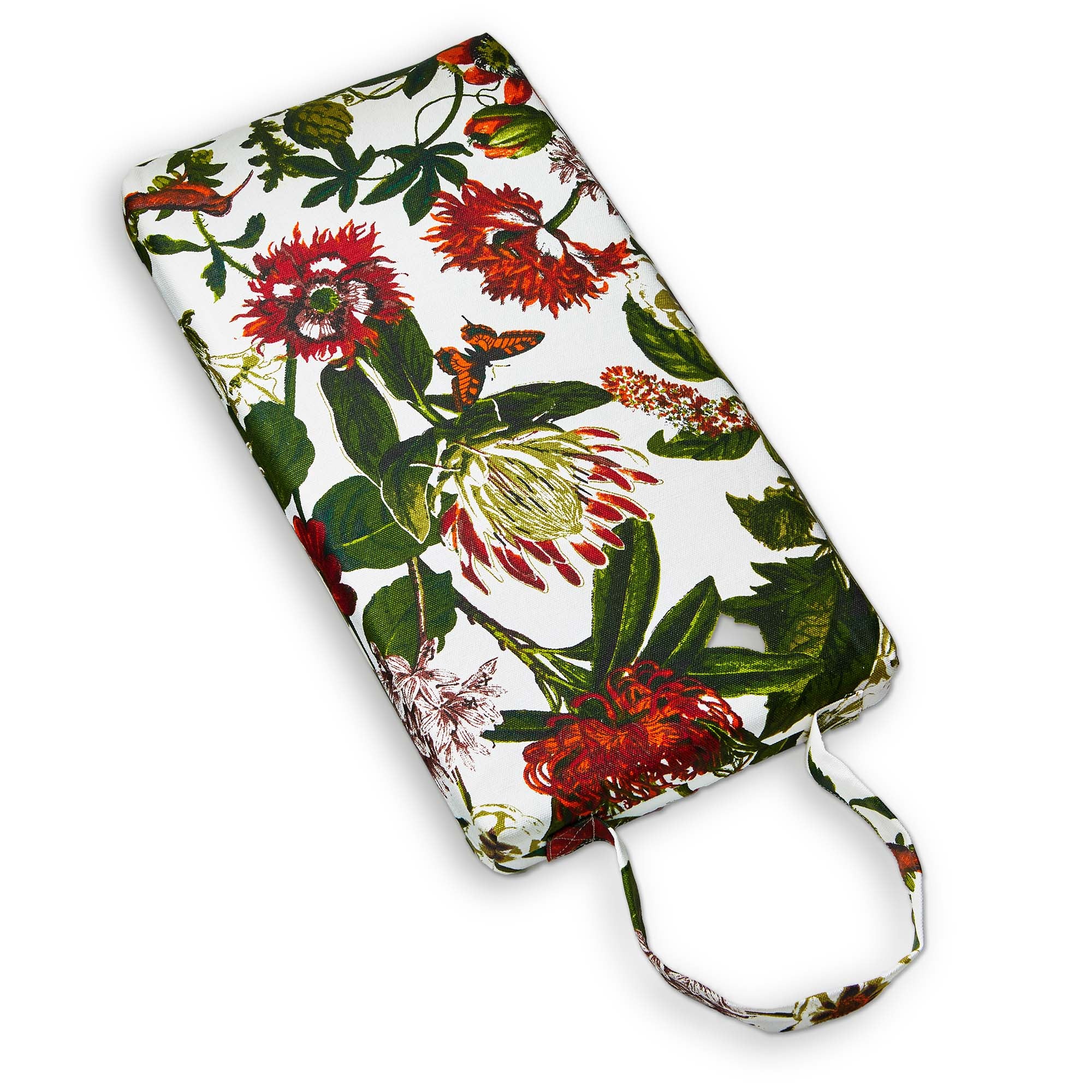 Protect your knees in style with the in the garden botanical kneeler pad. this comfortable pad features a beautiful botanical design, hand screen printed on water-repellent canvas for easy cleaning. the built-in handle allows for convenient carrying.