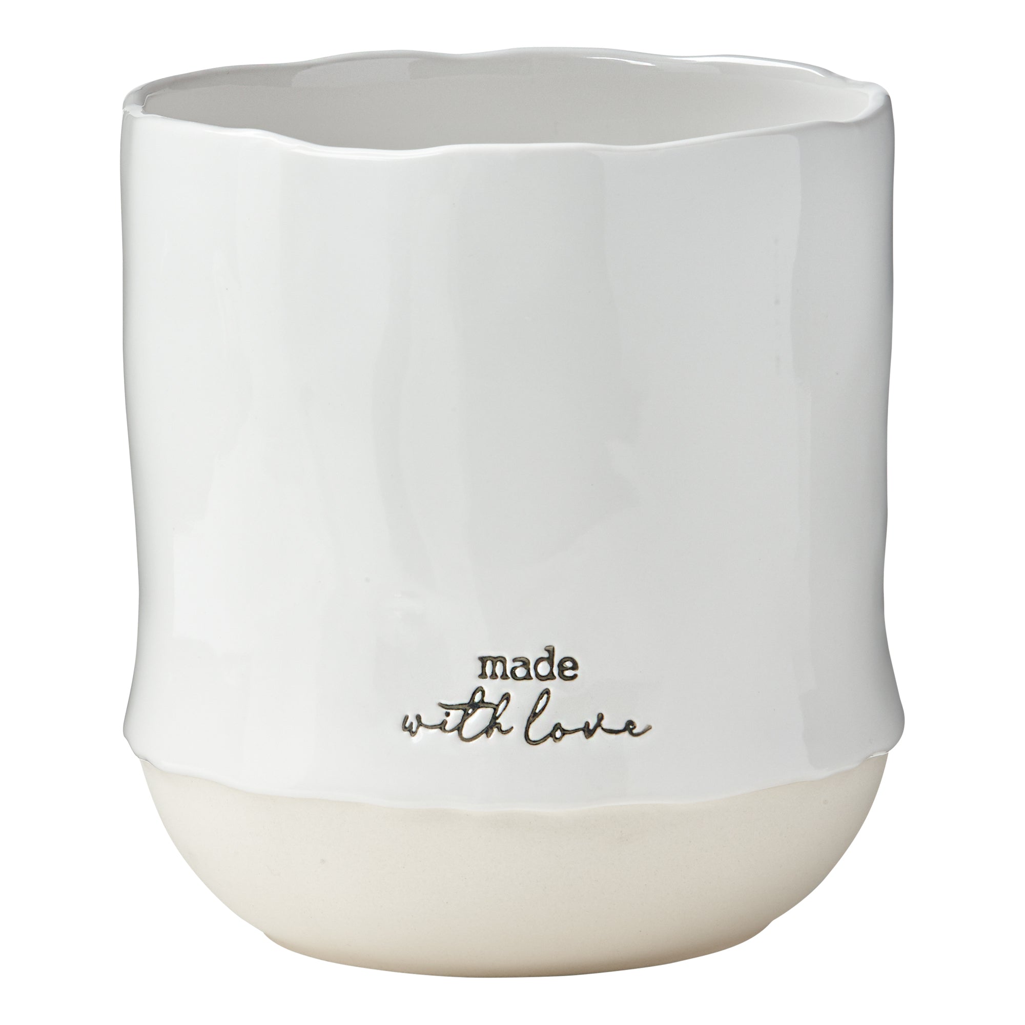 Store your kitchen tools in style. this stoneware utensil holder features a wax resist "made with love" sentiment, transparent glaze, and natural clay bottom.