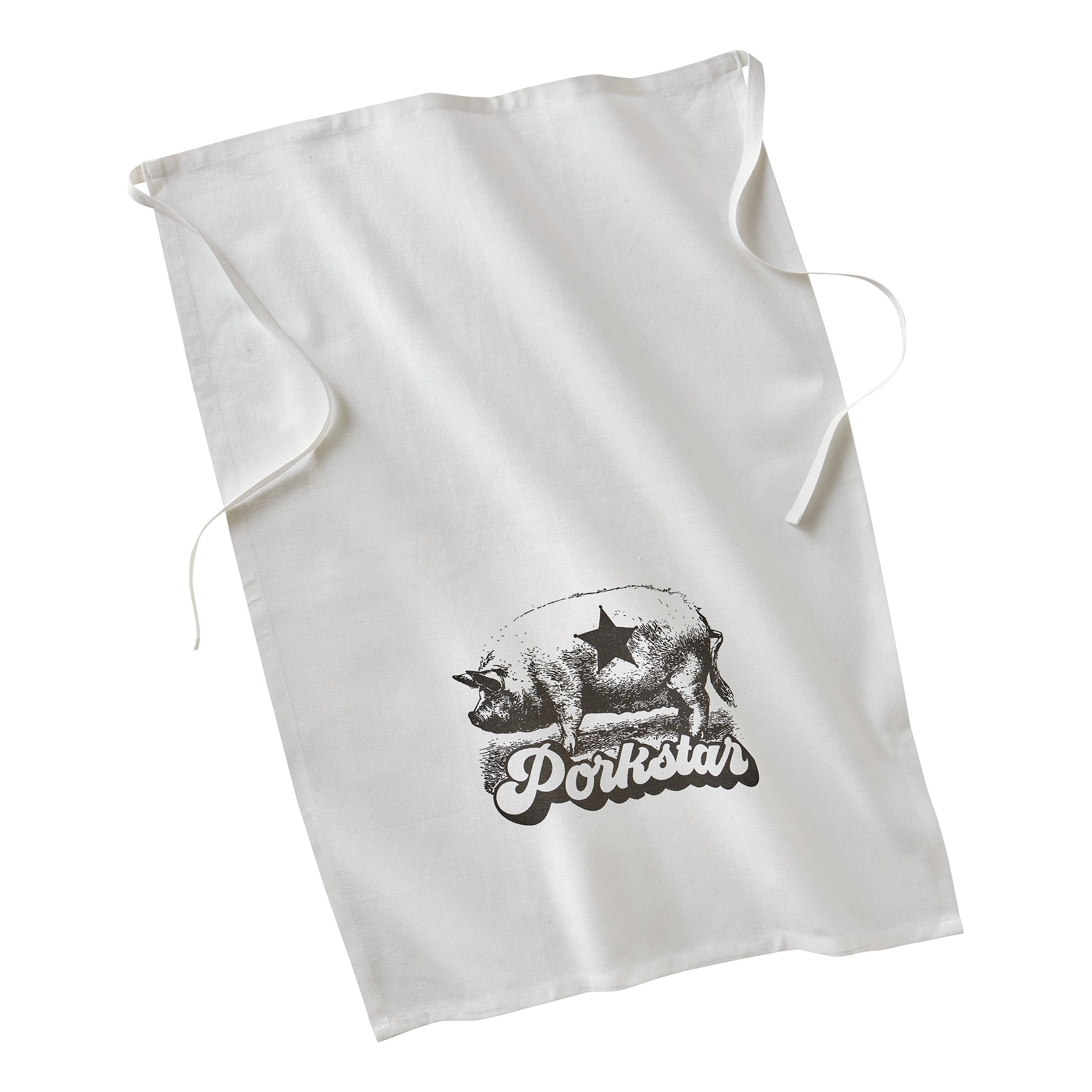 100% cotton bib with hand screen design. porkstar copy with pig graphic. ties around the neck and big enough to keep food from accidentally spillling onto clothes. a must have for any bbq outing!