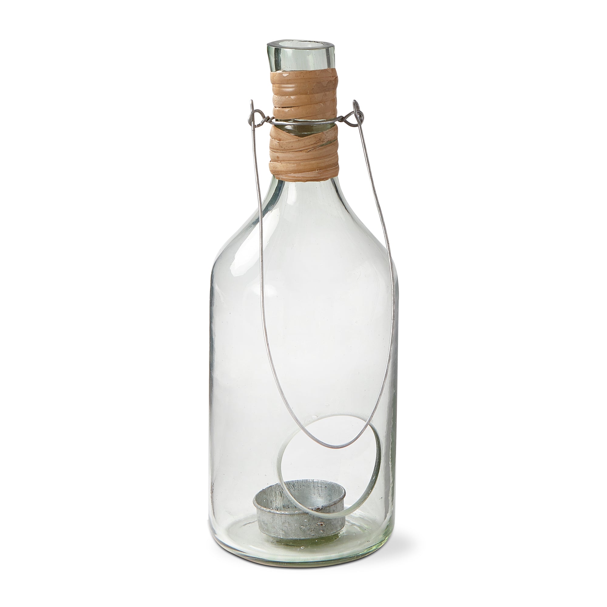 Set the scene with this blown glass lantern. This handcrafted lantern features recycled glass and mango wood construction, with an aluminum handle. A beautiful accent for any home or store display.