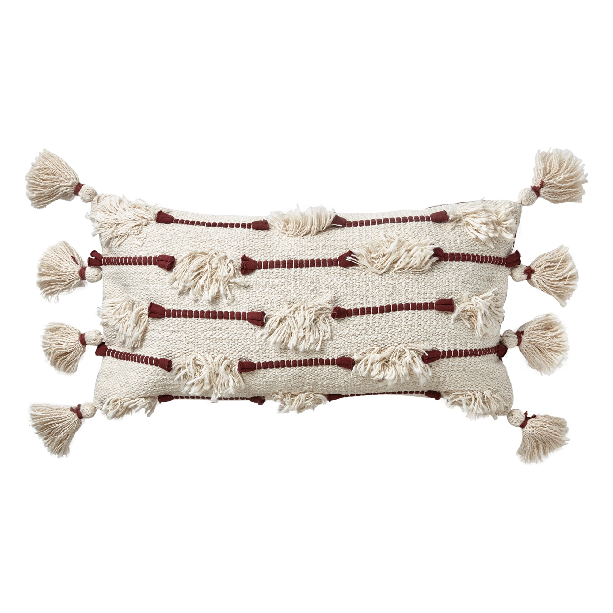 Perk up any seating area or bed with a pillow from tag. hand woven pillow with handmade tassels and solid backing. 100% cotton with hidden zipper closure. insert included.