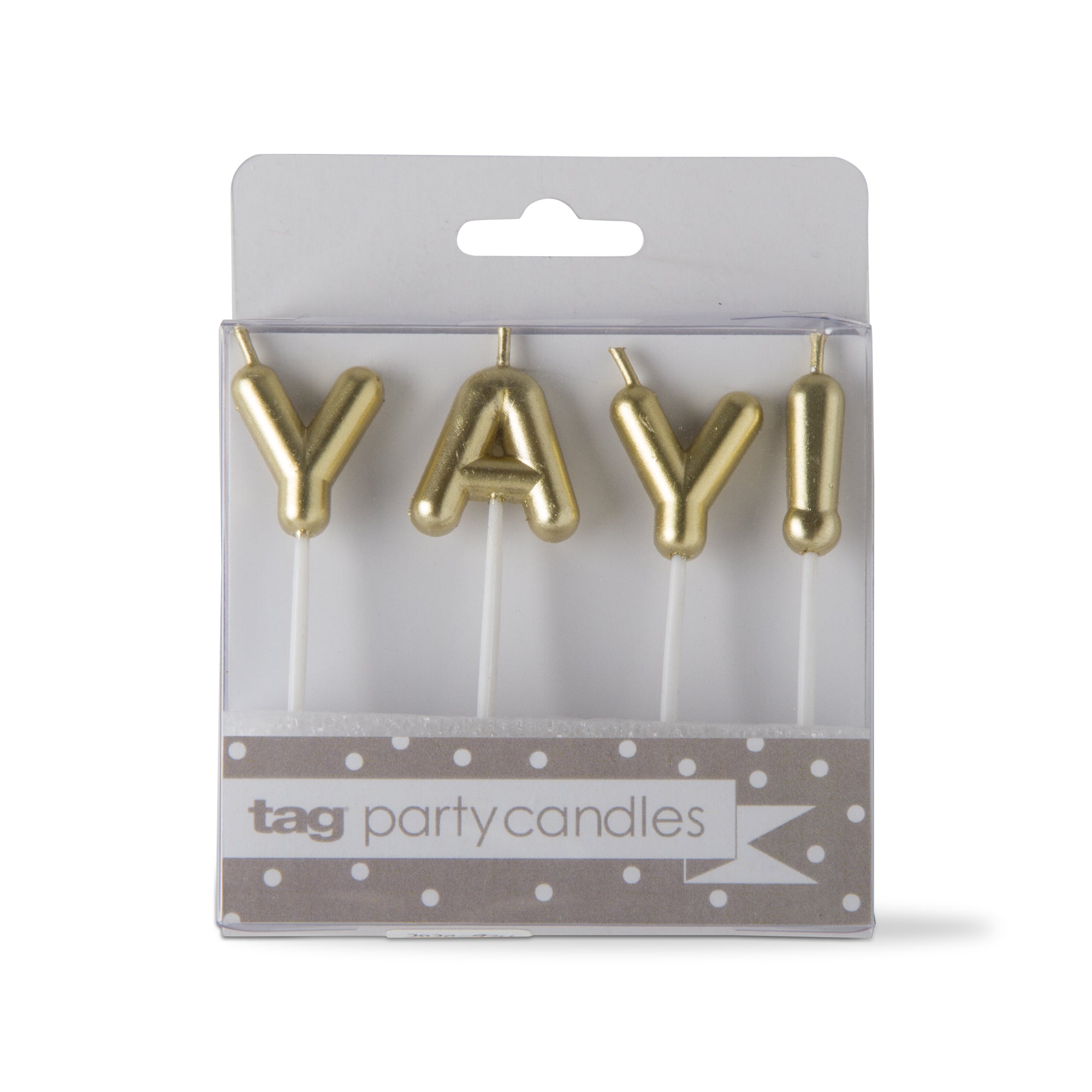 Celebrate that special occasion with tag! this yay celebration candle set is perfect for celebrations from birthdays to showers. use for a variety of milestone occasions including graduations, or to simply show friends and family some love. adds a touch of eye-catching flair to a variety of cakes and desserts.