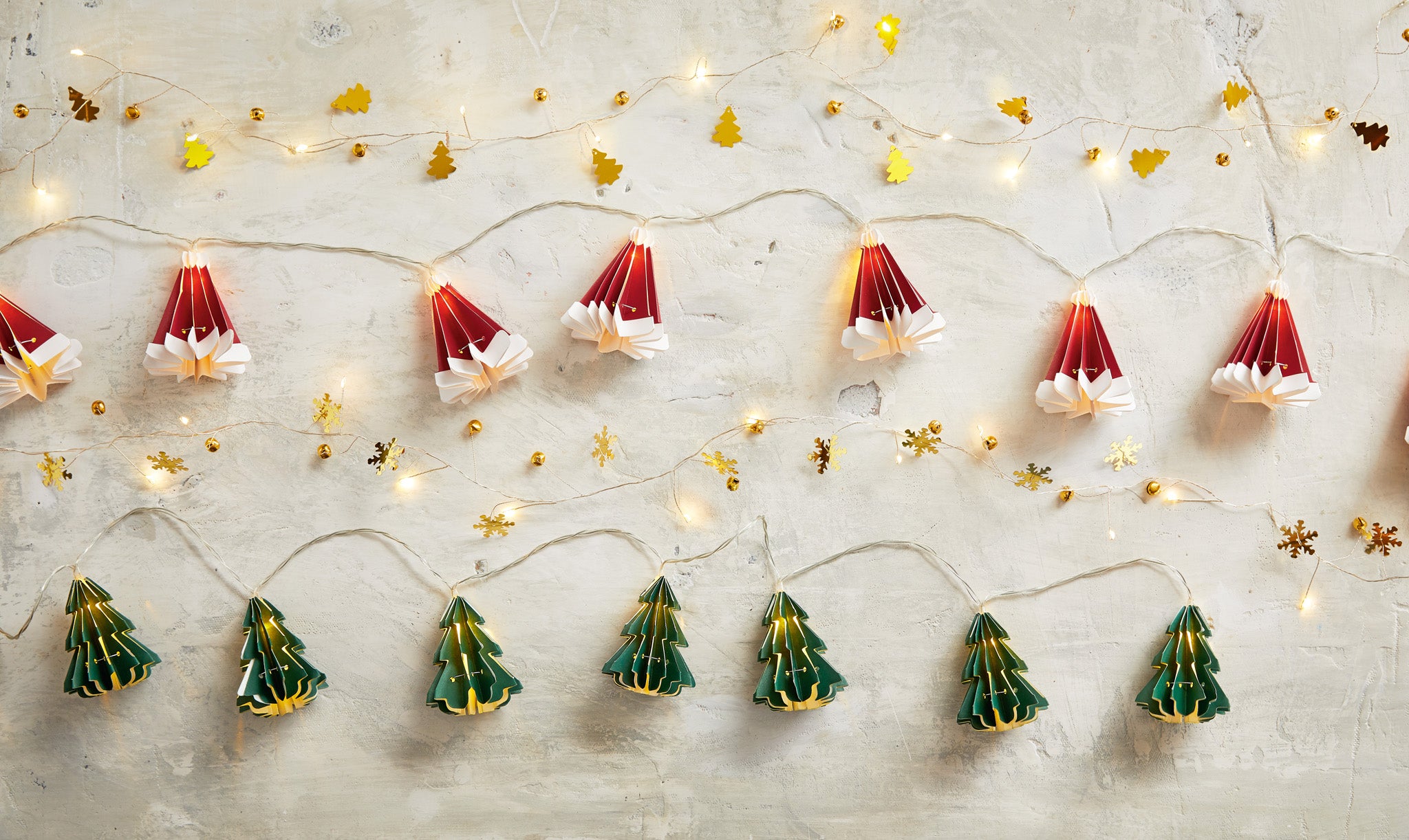 These paper tree string lights are a unique and whimsical way to decorate your home for the holidays. the green paper trees and warm white led lights will create a magical and enchanting atmosphere.