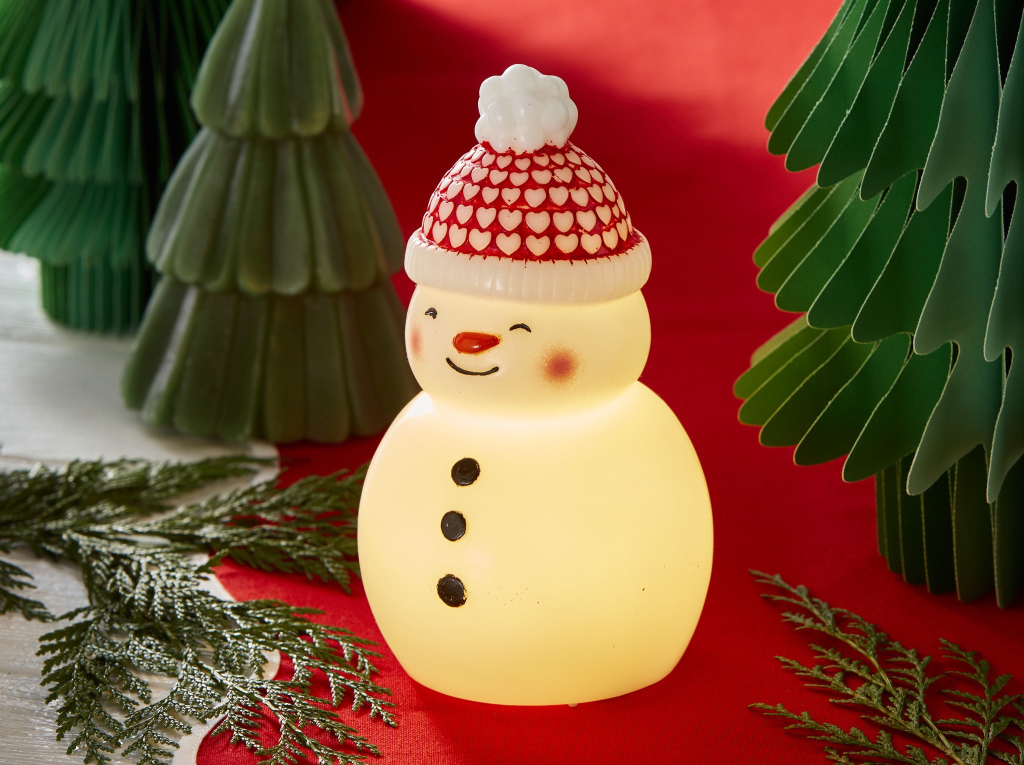 Spread some winter cheer with this delightful Snowman LED Decor. Made from paraffin wax and plastic, this snowman features a cute red and white hat and a warm LED glow.