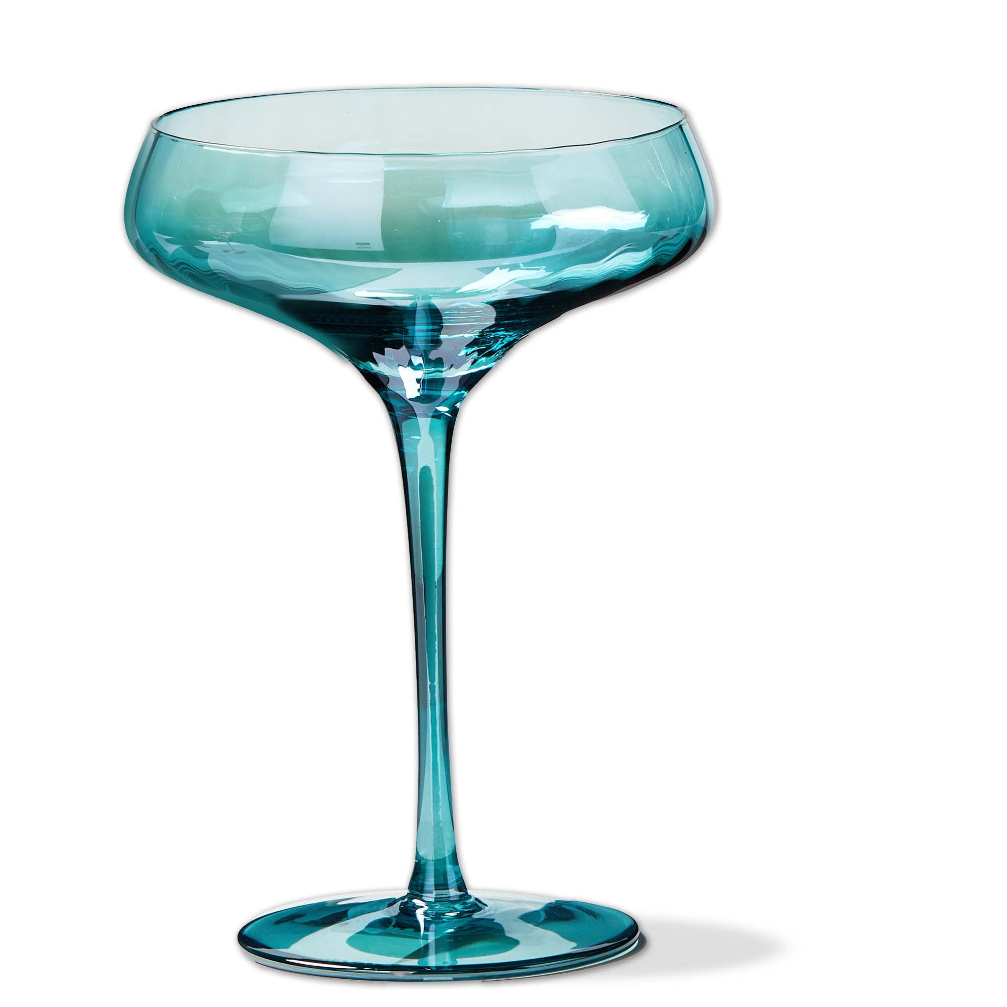 Add a touch of vintage glamour to your table setting with this elegant coupe glass. mouth-blown by skilled artisans, the glass features a captivating iridescent aqua finish that shimmers and changes color depending on the light. the wide, shallow bowl is perfect for enjoying champagne, cocktails, or desserts. hand wash recommended to preserve the delicate finish.