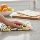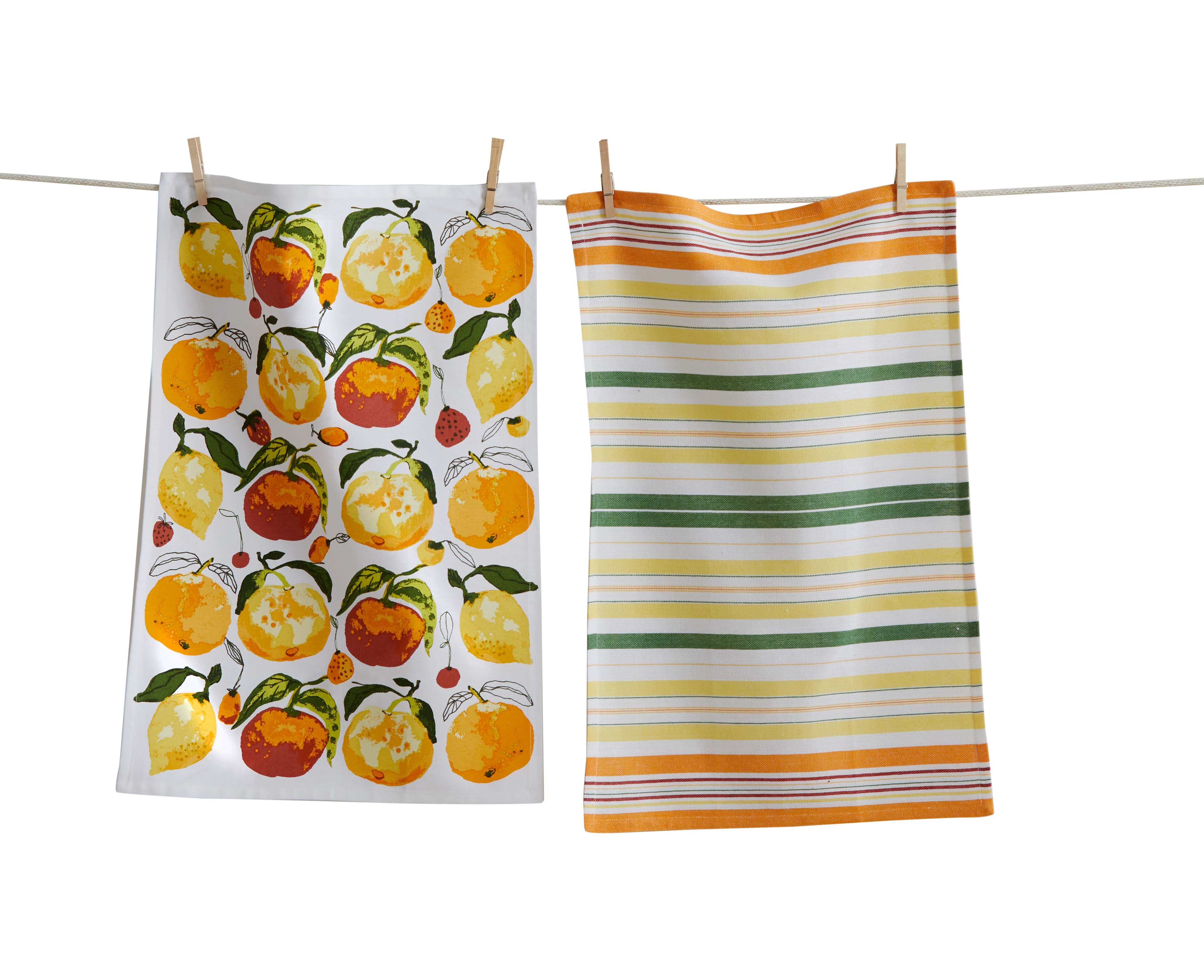 Set of two cotton dishtowels: one hand screen-printed satin weave with various citrus fruits, and one horizontal satin stripe yarn dye. Includes hang loops. View all items in Loom & Weave.