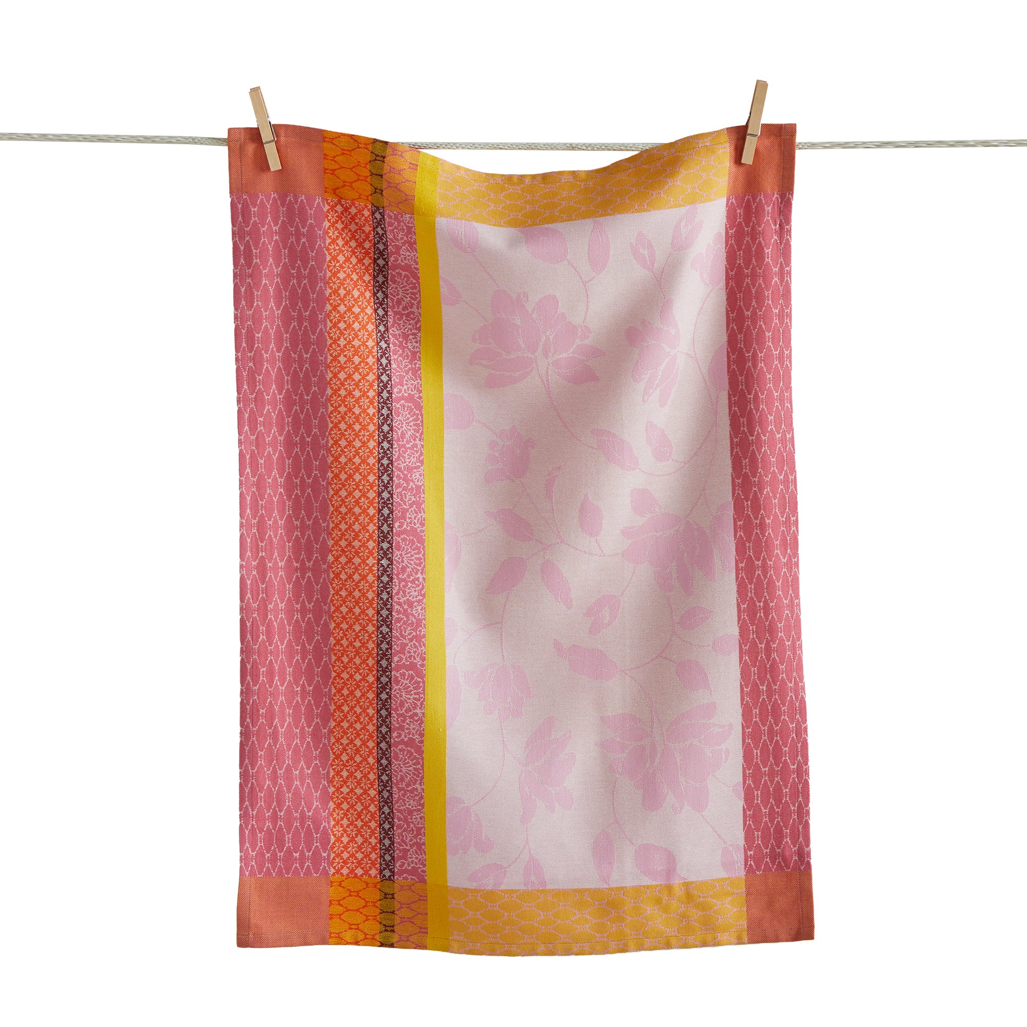 A blush floral jacquard center is framed by vibrant woven borders. 100% cotton brings color, absorbency, and gift-ready style. View all items in Loom & Weave.