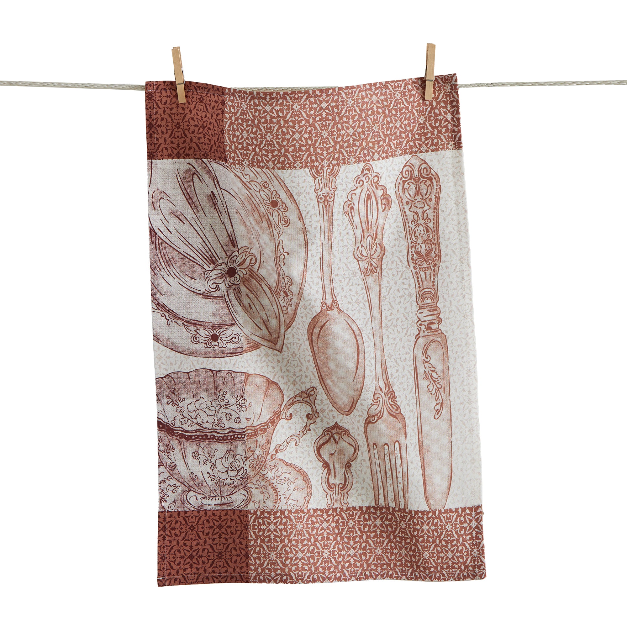 Vintage place-setting art and brick-red damask borders give a bistro feel. Absorbent cotton is gift-worthy and made for daily dishes. View all items in Loom & Weave.