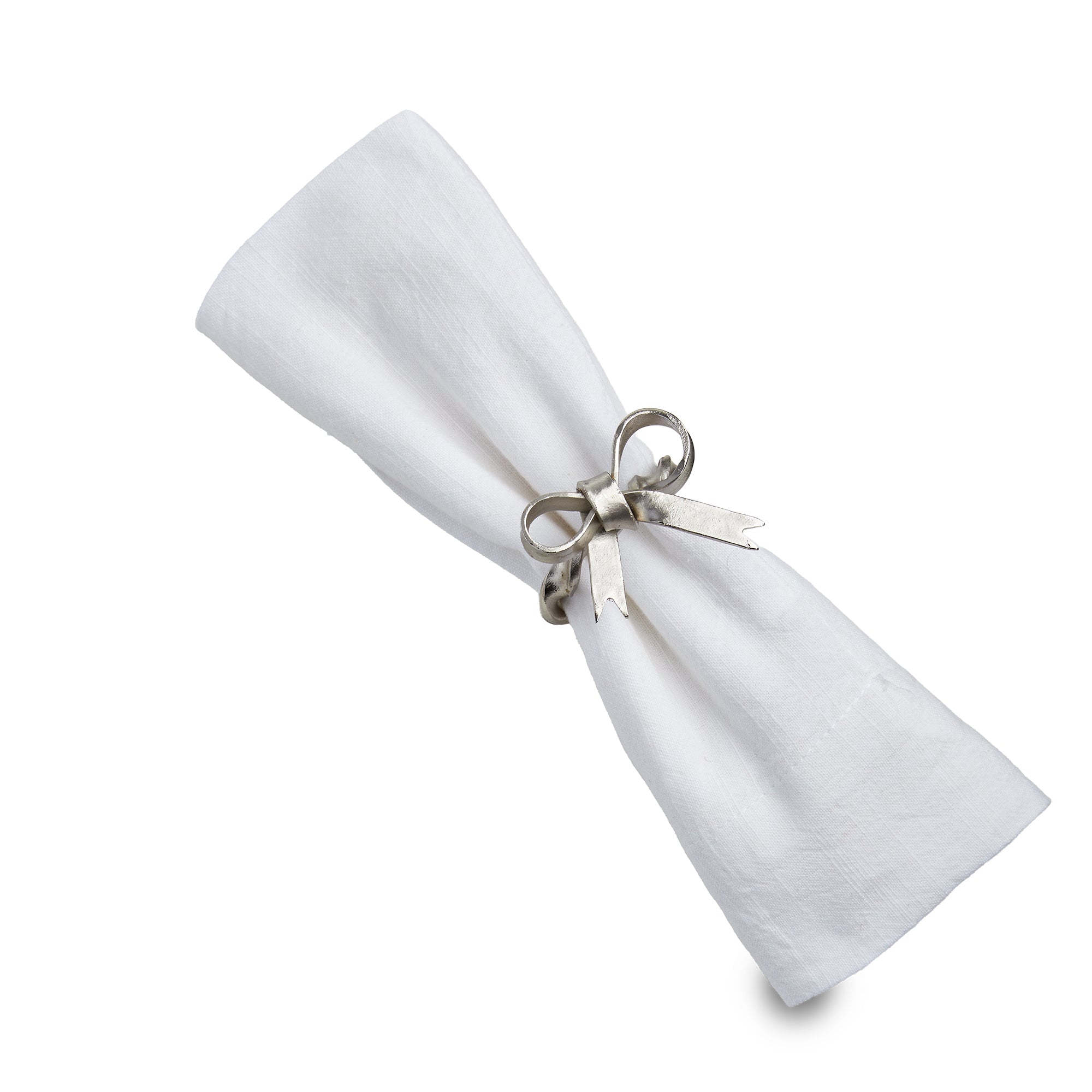 Polished silver bow napkin ring crafted from iron with a sculptural holiday bow design. Adds a festive touch to seasonal tables and hosting moments. Hand painted details add warmth while its versatile design makes styling simple. Sized for layered displays and pairs beautifully with seasonal greenery and décor. View all items in Winter Berries.
