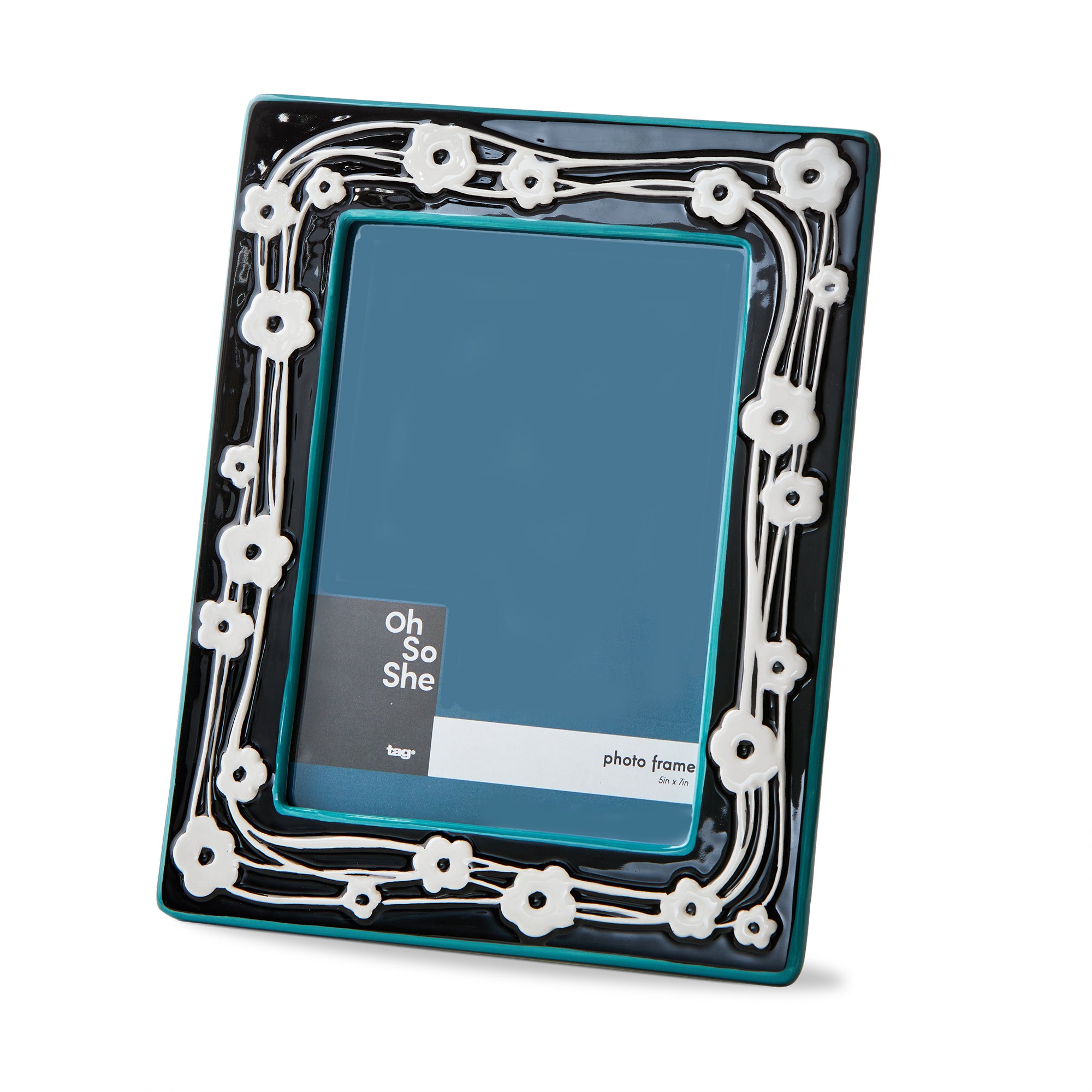 Daisy Ceramic Photo Frame 5 x 7 with white daisies on a black ceramic border for bold contrast. Showcase family portraits or travel shots on a console or bookshelf. View all items in Oh So She.