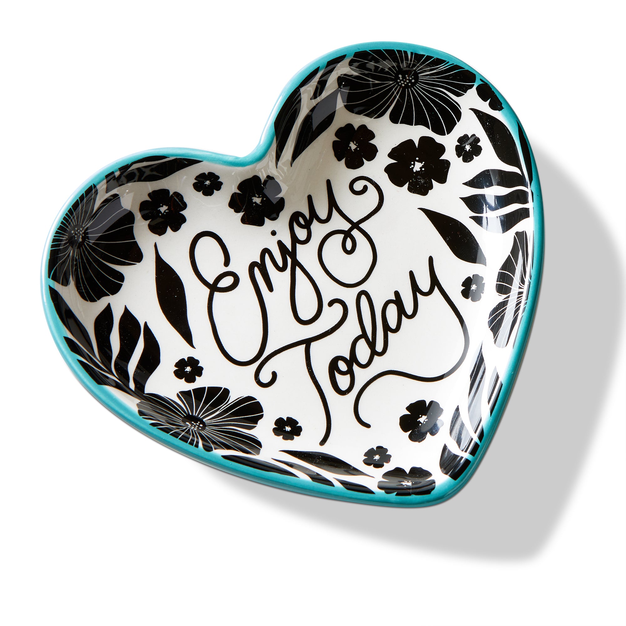 Enjoy Today Heart Decorative Bowl in ceramic with a hand drawn script interior, black and white pattern, and teal accent rim. Use as a bedside ring dish, a candy bowl near the door, or a keys and coins catchall on an entry table. View all items in Oh So She.