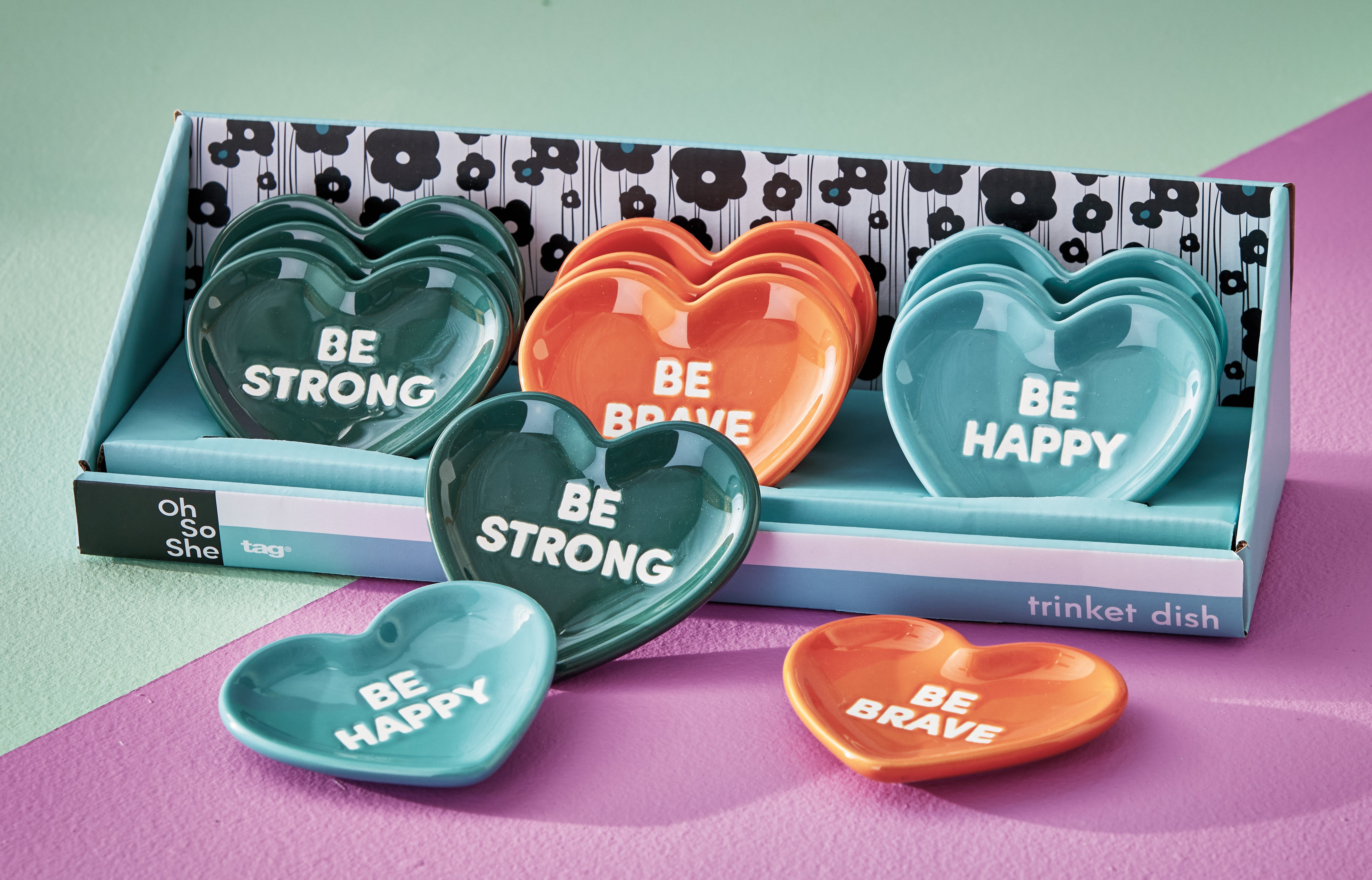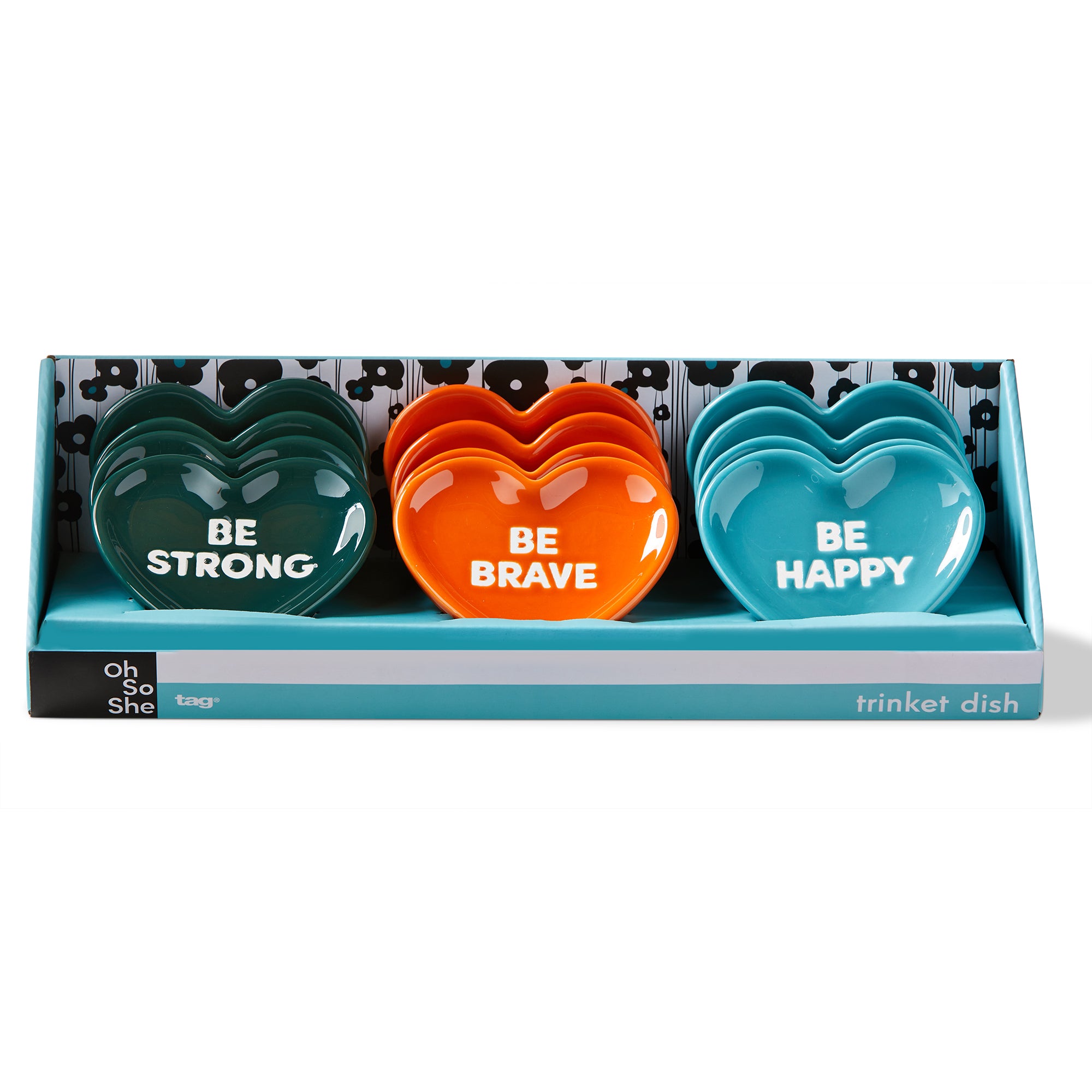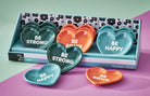 Heart Trinket Dish Assortment counter display of twelve ceramic heart dishes in bold colors with positive words. Ideal at the register for quick gifting, perfect as ring rests, favor dishes, or little desk catchalls. View all items in Oh So She.